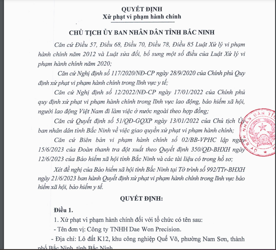 Ngoài bị phạt bằng tiền, Công ty TNHH Dae Won Precision cũng bị buộc truy nộp số tiền bảo hiểm xã hội bắt buộc, bảo hiểm thất nghiệp, bảo hiểm y tế phải đóng là 600 triệu đồng về tài khoản thu của Bảo hiểm xã hội Bắc Ninh. Buộc nộp số tiền lãi chậm đóng bảo hiểm xã hội bắt buộc, bảo hiểm thất nghiệp, bảo hiểm y tế là 116 triệu đồng.
