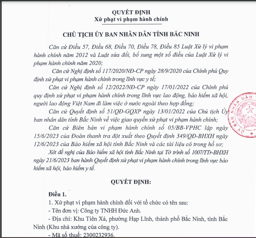 Còn theo quyết định xử phạt số 767/QĐ-XPHC, Chủ tịch UBND tỉnh Bắc Ninh quyết định xử phạt tổng số tiền 154 triệu đồng đối với Công ty TNHH Đức Anh (địa chỉ: khu Tiên Xá, phường Hạp Lĩnh, thành phố Bắc Ninh - người đại diện theo pháp luật là ông Đỗ Tuấn Phong - Giám đốc).
