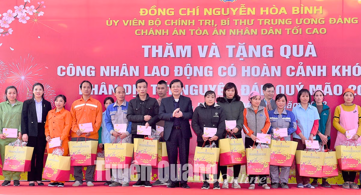 Chiều 9/1, Đoàn công tác của Trung ương do ông Nguyễn Hòa Bình, Ủy viên Bộ Chính trị, Bí thư Trung ương Đảng, Chánh án Tòa án nhân dân (TAND) tối cao làm Trưởng đoàn đã tới thăm và tặng quà gia đình chính sách, công nhân lao động có hoàn cảnh khó khăn tỉnh Tuyên Quang nhân dịp Tết Nguyên đán Quý Mão 2023 tại Khu công nghiệp Long Bình An.
