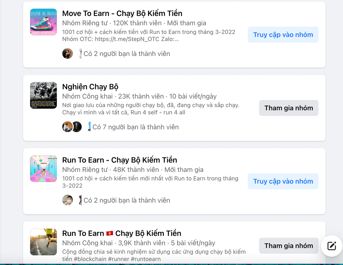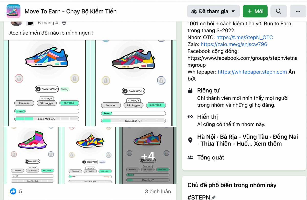 Gần đây, trên các hội nhóm mạng xã hội nở rộ thông tin về trào lưu kiếm tiền mới: “move to earn” (di chuyển để kiếm tiền). Chỉ cần gõ cụm từ “đi bộ kiếm tiền”, “chạy bộ kiếm tiền”, có đến hàng chục hội nhóm trên Facebook sẽ hiện ra với số lượng thành viên đông đảo, từ vài ngàn đến cả vài chục ngàn thành viên tham gia.