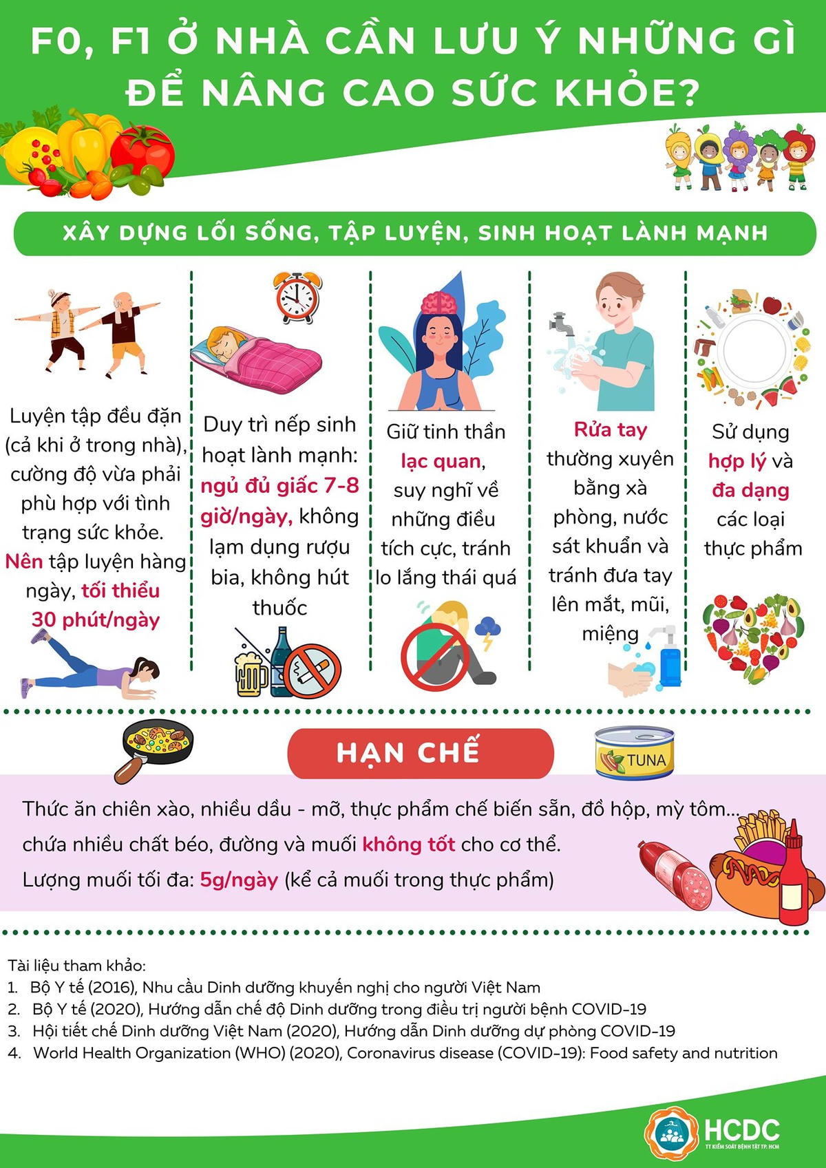Theo chia sẻ từ HCDC, một chế độ dinh dưỡng, sinh hoạt hợp lý sẽ giúp cơ thể khỏe mạnh, tăng cường sức đề kháng giúp bản thân vượt qua được bệnh tật. Các F0, F1 khi thực hiện cách ly tại nhà cần lưu ý một số vấn đề sau để nâng cao sức khỏe.