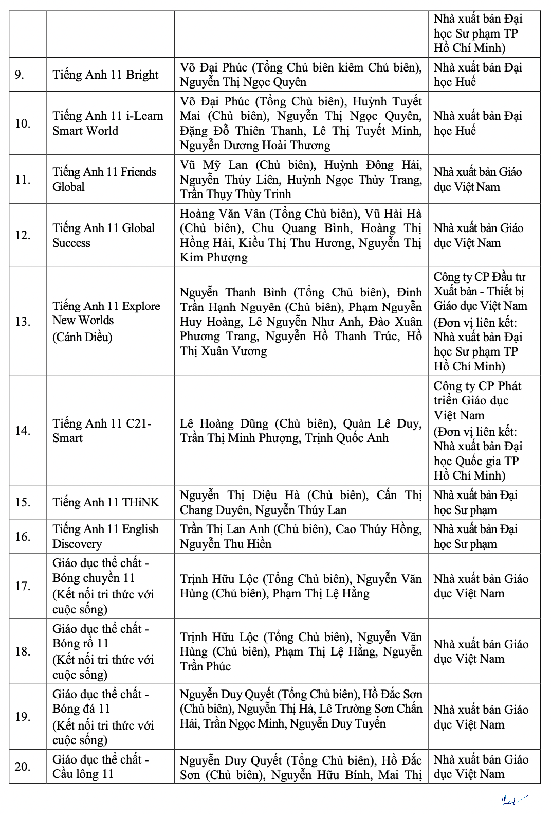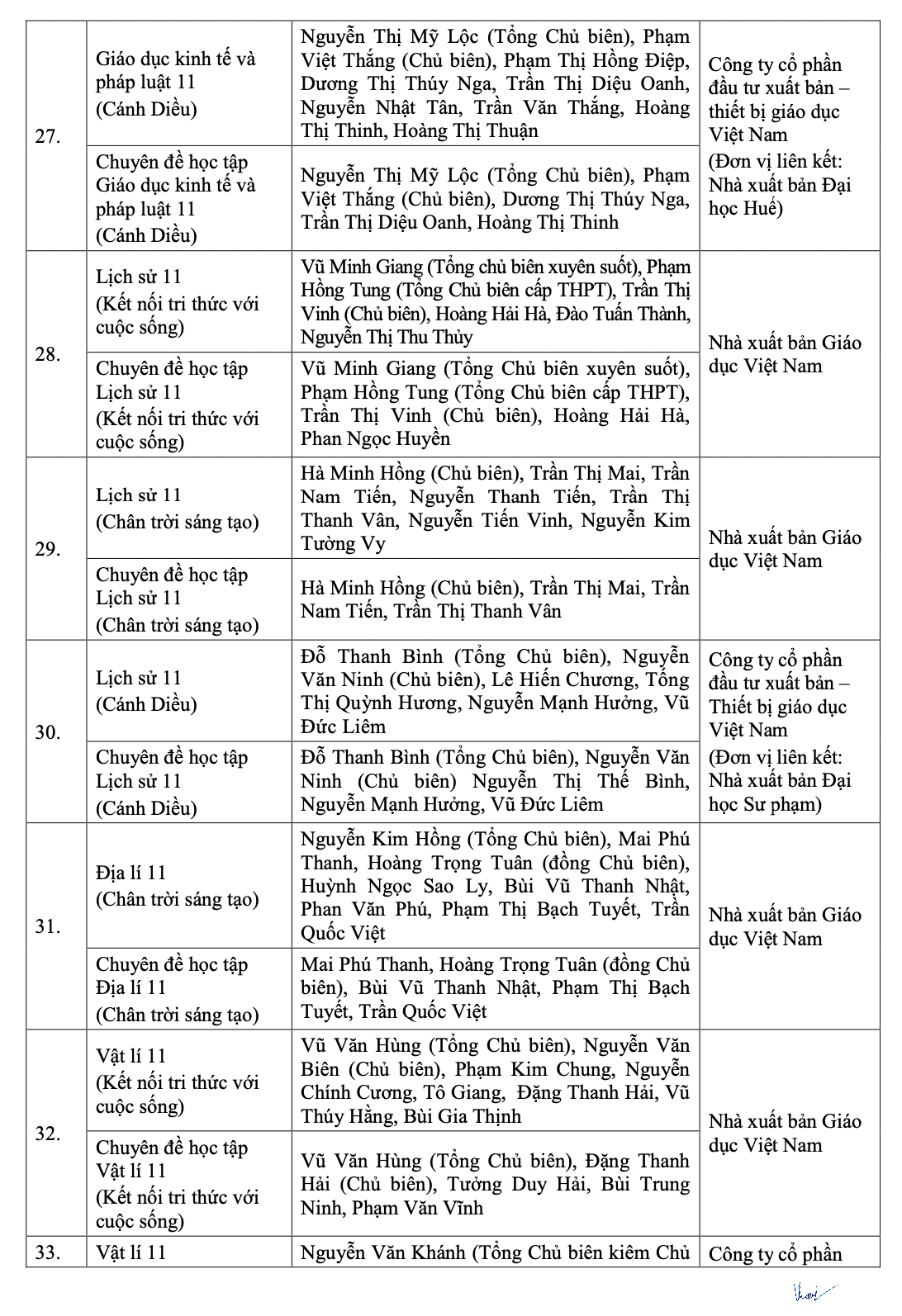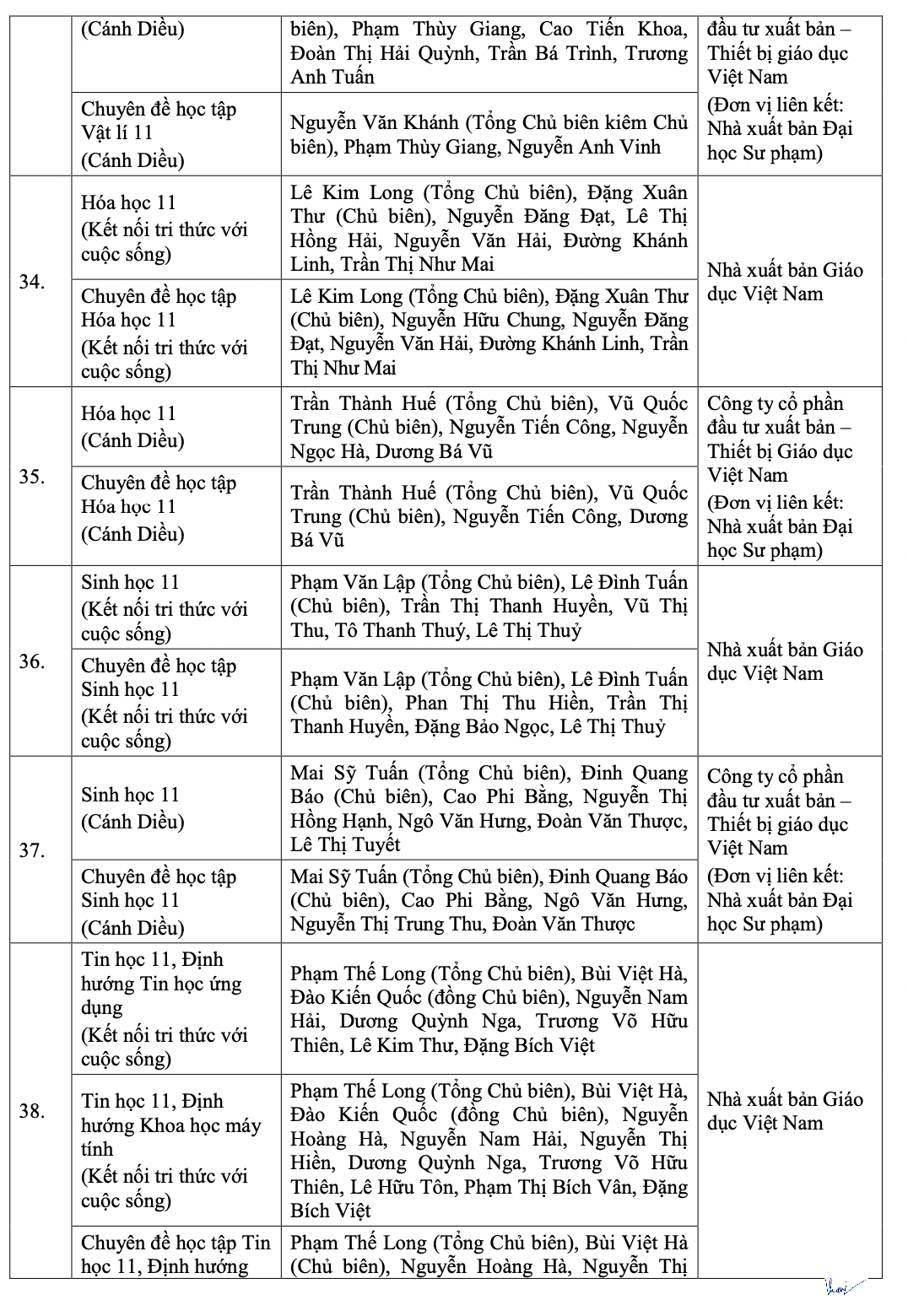 Đối với danh mục sách giáo khoa lớp 11 được phê quyệt, Sách giáo khoa Cánh diều được chọn 100% quyển sách mà NXB này phát hành. Bộ sách Kết nối tri thức với cuộc sống được chọn 32/34 quyển. Tuy nhiên năm nay bộ sách Chân trời sáng tạo chỉ được chọn 16/34 quyển.