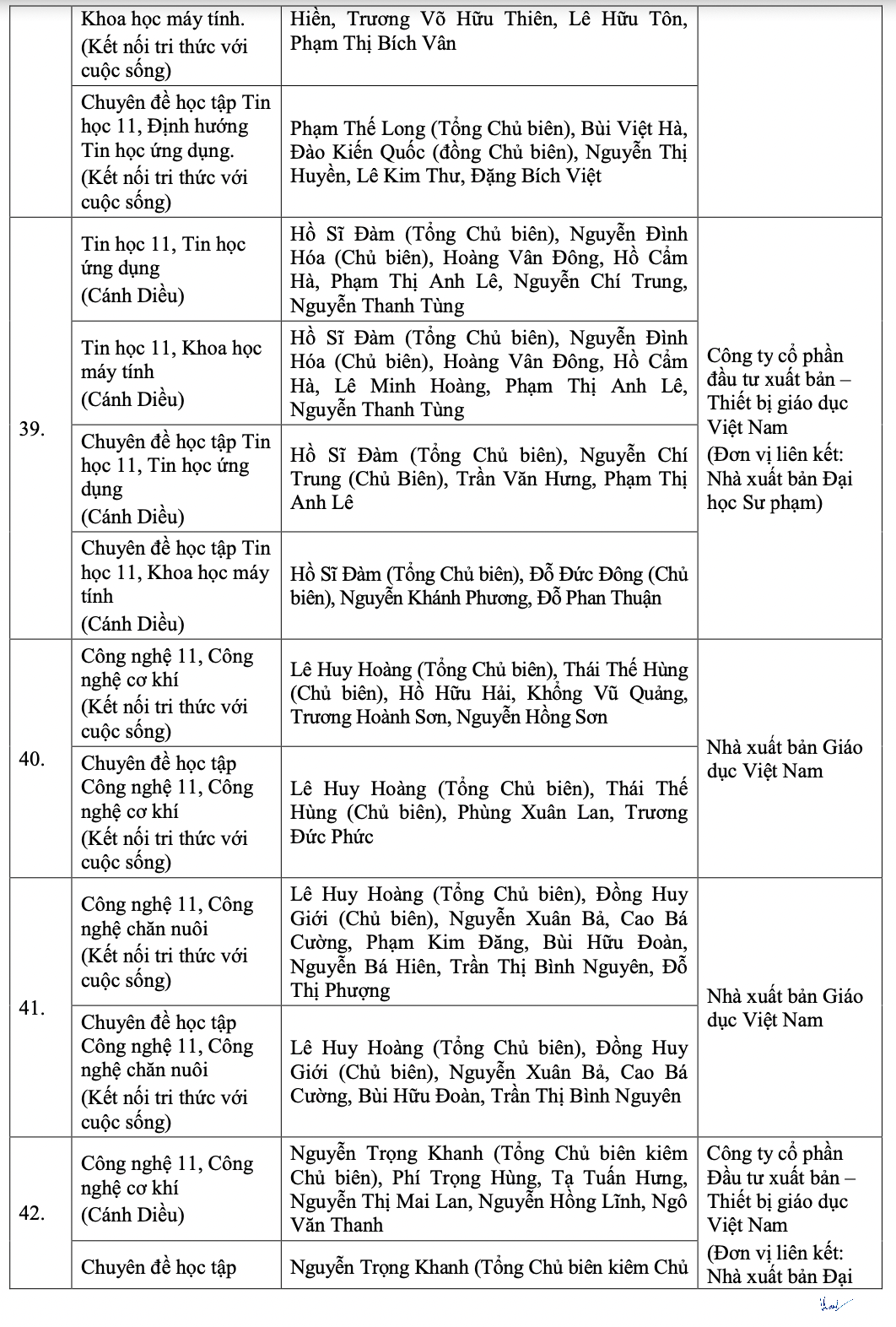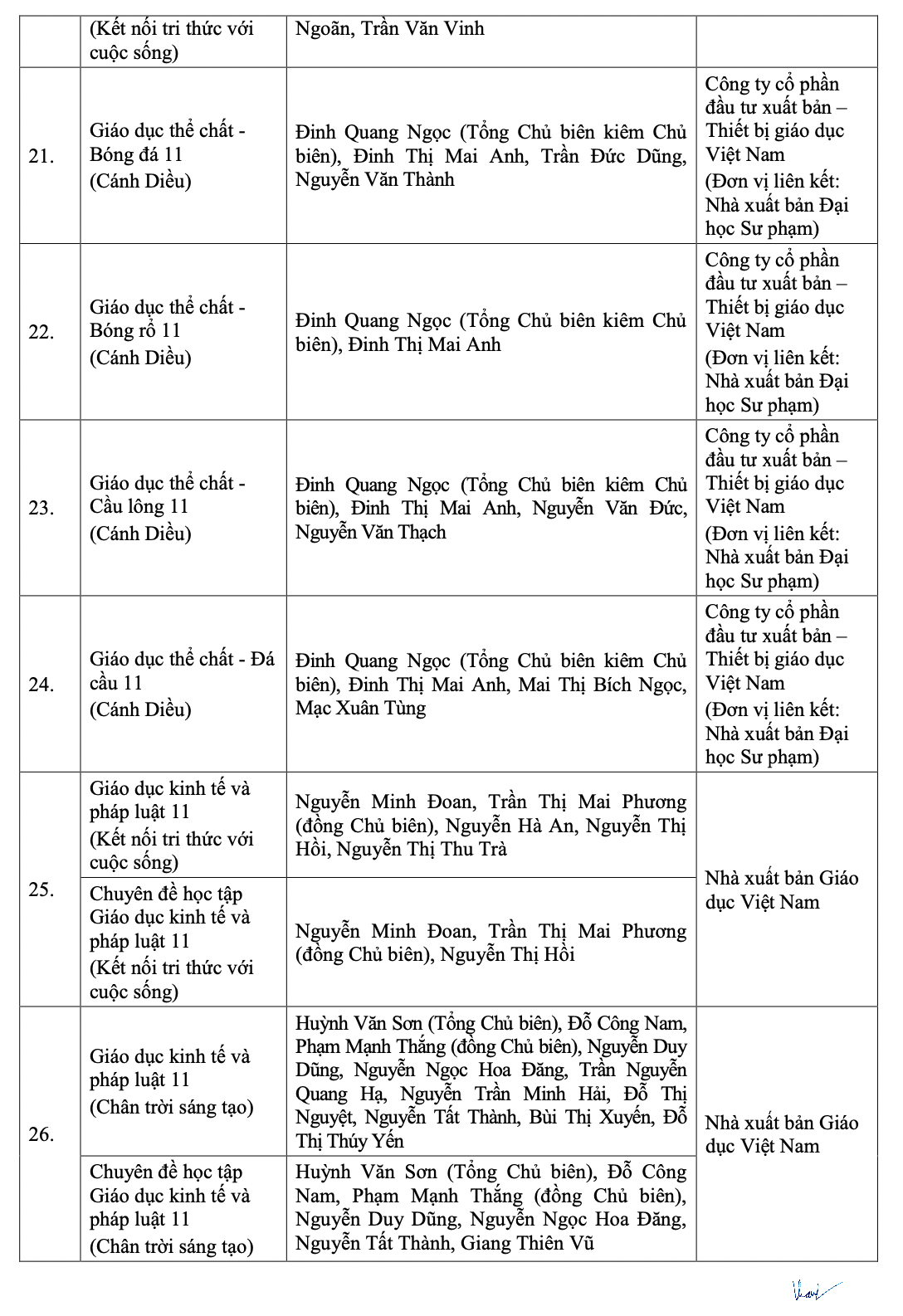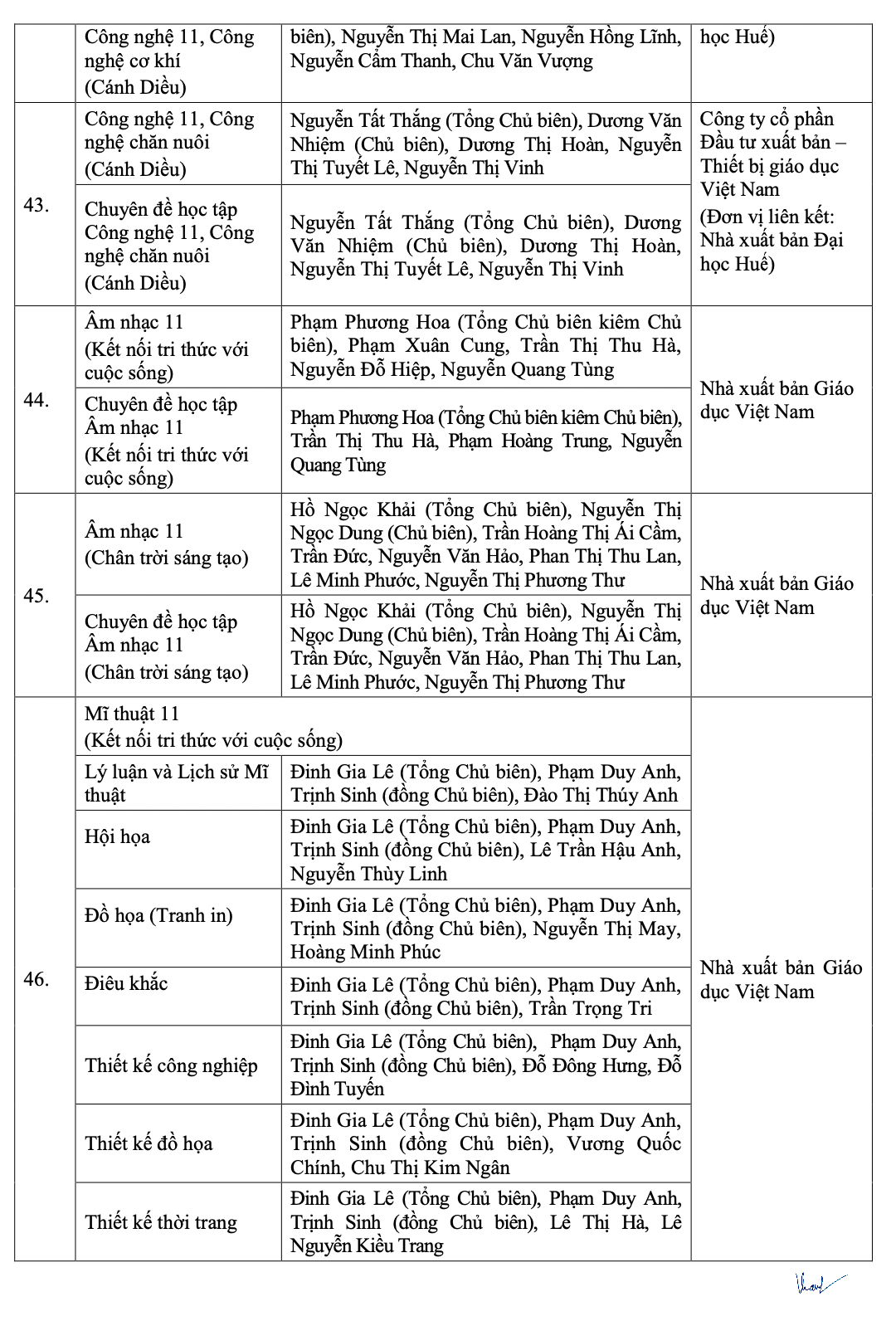Đối với danh mục sách giáo khoa lớp 11 được phê quyệt, Sách giáo khoa Cánh diều được chọn 100% quyển sách mà NXB này phát hành. Bộ sách Kết nối tri thức với cuộc sống được chọn 32/34 quyển. Tuy nhiên năm nay bộ sách Chân trời sáng tạo chỉ được chọn 16/34 quyển.