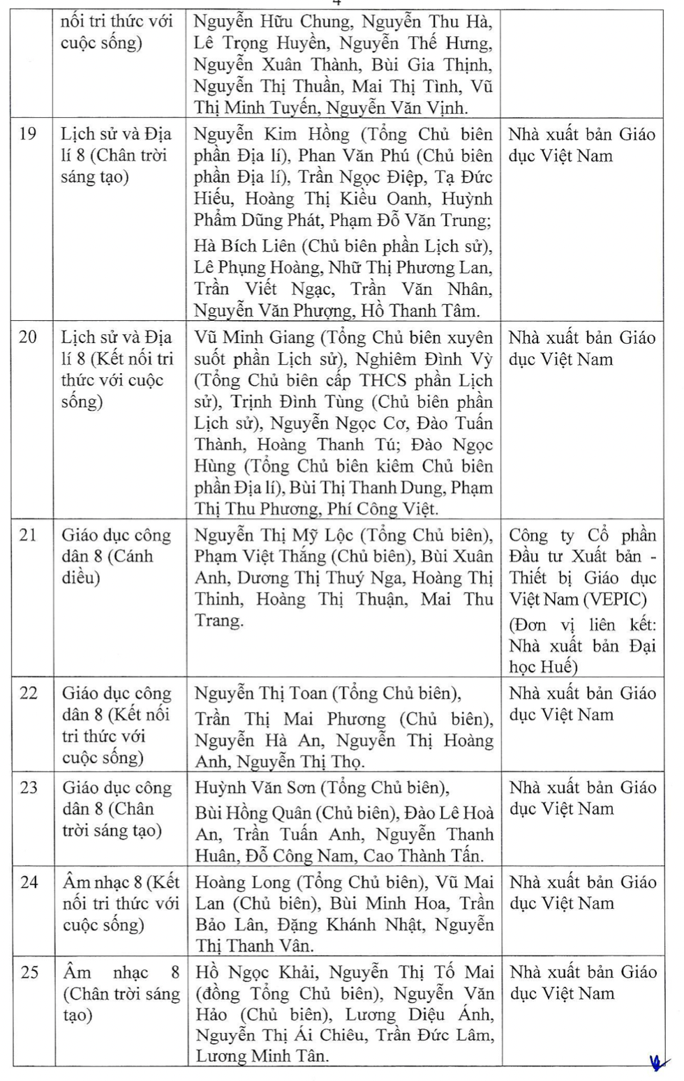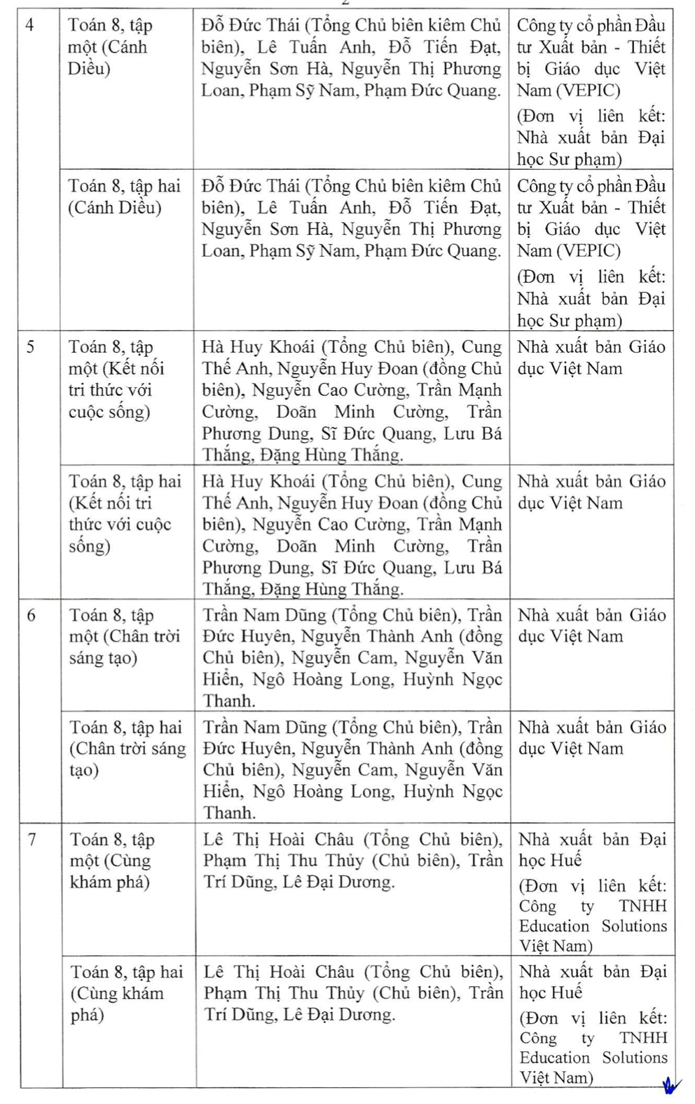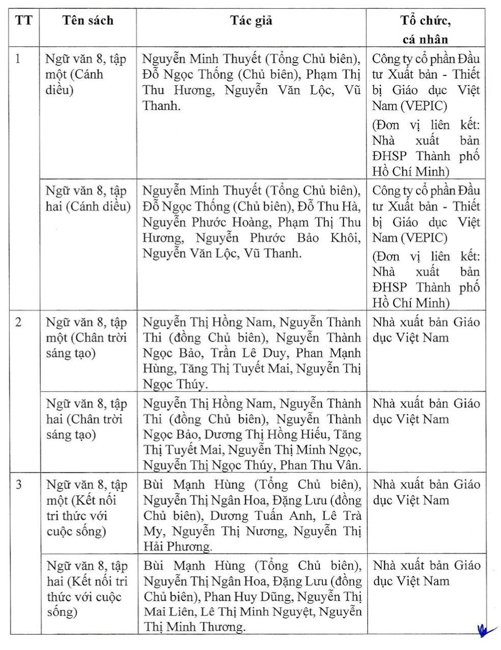 Danh mục sách giáo khoa lớp 8 đã được Bộ GDĐT phê duyệt như sau: