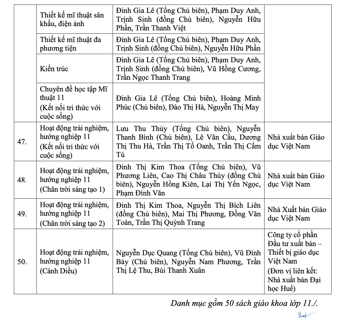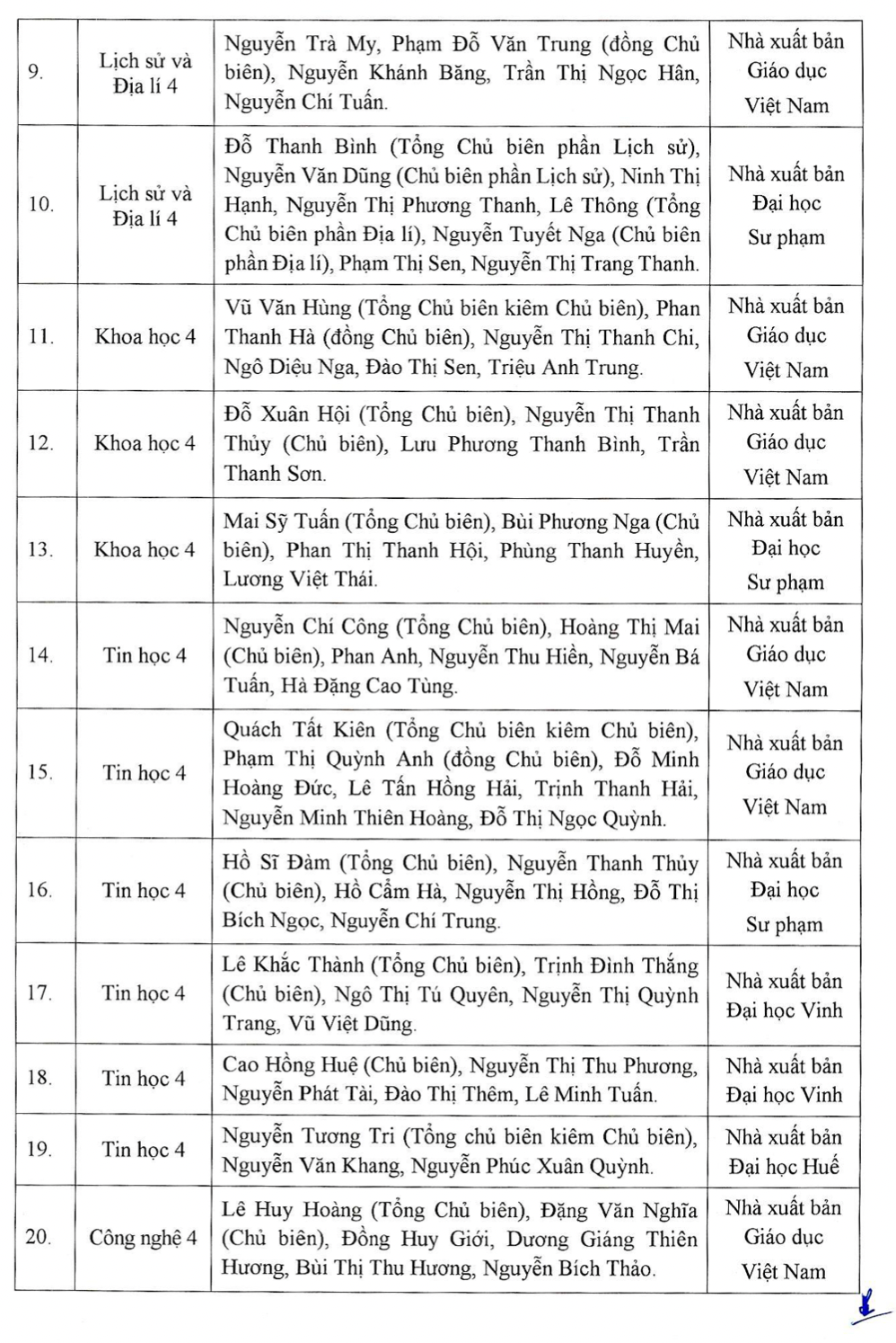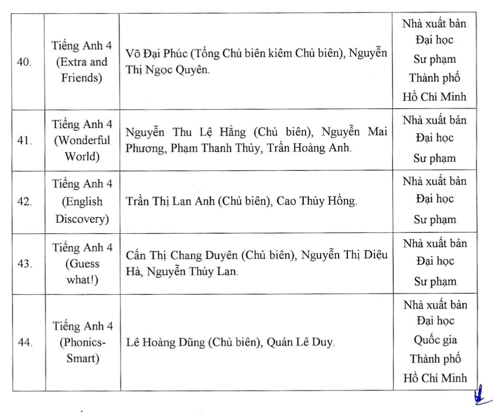 Cụ thể, danh mục sách giáo khoa lớp 4 bao gồm 44 đầu sách giáo khoa; danh mục sách giáo khoa lớp 8 bao gồm 42 đầu sách giáo khoa; danh mục sách giáo khoa lớp 11 bao gồm 50 đầu sách.