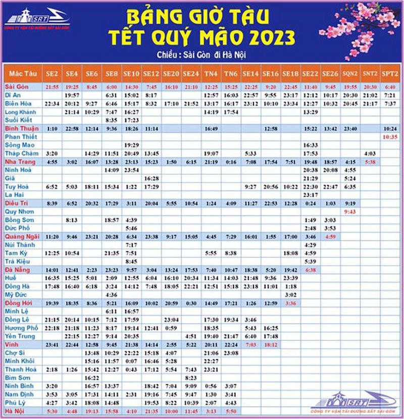 Để phục vụ nhu cầu đi lại của hành khách trong dịp Tết Nguyên Đán Quý Mão 2023 từ ngày 9/1/2023 đến hết ngày 5/2/2023 (tức từ ngày 18 tháng Chạp năm Nhâm Dần đến ngày 15 tháng Giêng năm Quý Mão), Tổng Công ty đường sắt Việt Nam tổ chức chạy tàu như sau: