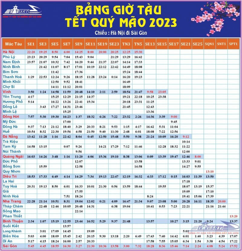 - Trong thời gian nghỉ Tết (từ ngày 21/1/2023 đến ngày 24/1/2023 tức từ ngày 30/12/2022 đến 3/1/2022 Âm lịch), Công ty còn tổ chức chạy thêm một số đôi tàu trên các tuyến: Sài Gòn - Huế, Sài Gòn – Đà Nẵng, Sài Gòn – Tam Kỳ, Sài Gòn – Quảng Ngãi và Sài Gòn – Nha Trang.