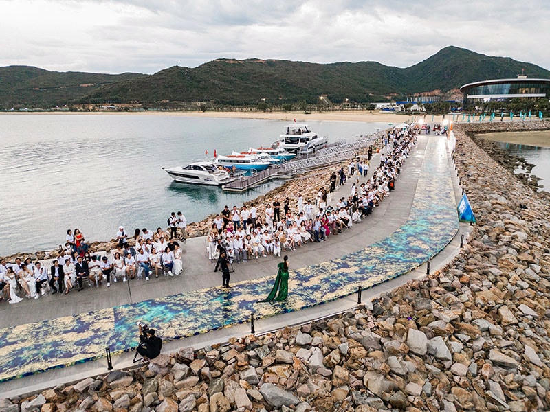 Chiếc cầu tàu uốn lượn từ khu vực Sales Gallery nối dài ra biển, khoác lên mình hình ảnh hoàn toàn khác biệt khi trở thành sàn catwalk chính với chiều dài hơn 300m của Vietnam Beauty Fashion Fest – sự kiện nằm trong khuôn khổ vòng chung kết Miss World Vietnam 2022.