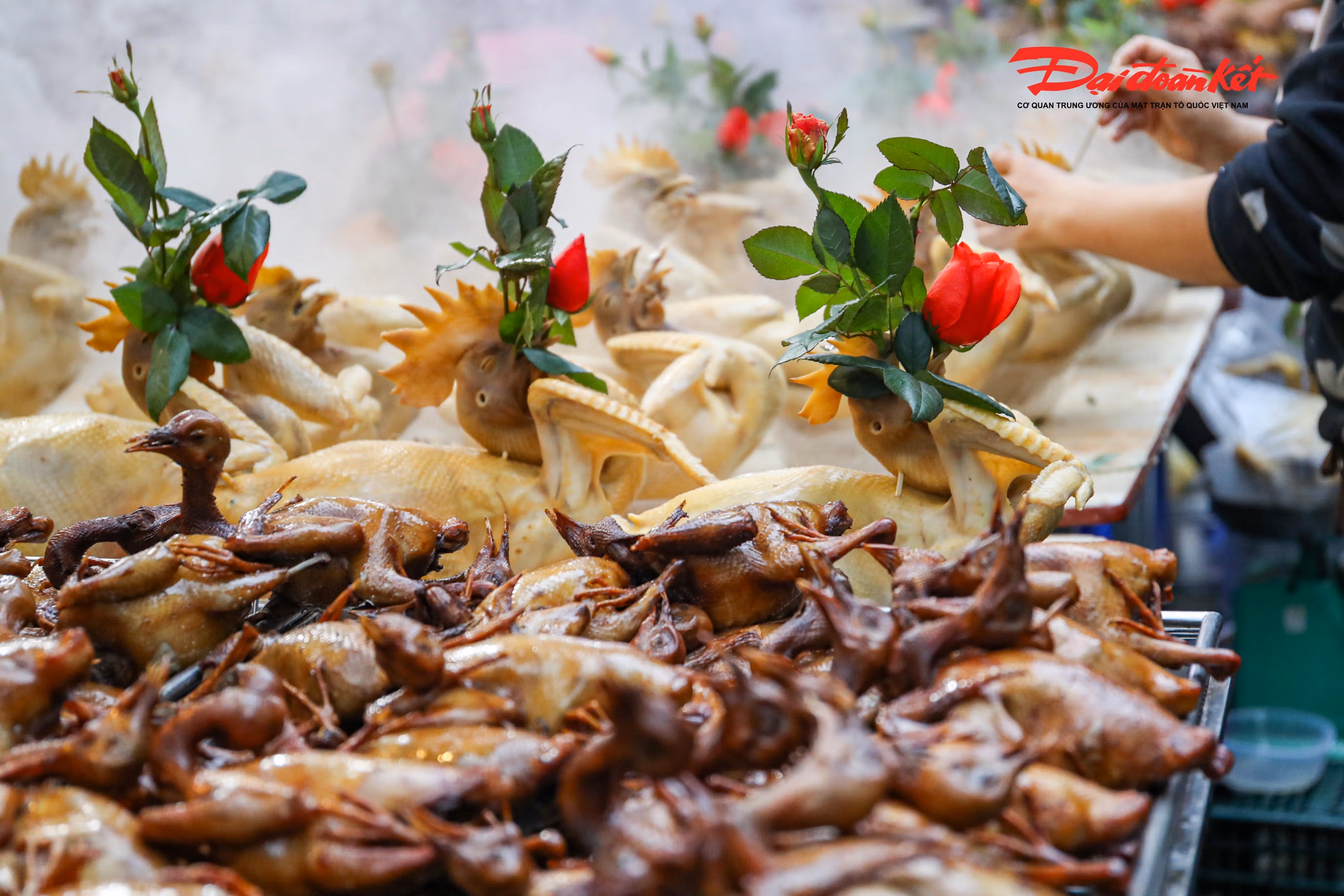 Trong số các lễ vật, gà luộc ngậm hoa hồng là mặt hàng được nhiều người lựa chọn nhất, với mức giá dao động khoảng 500.000 đồng mỗi con.