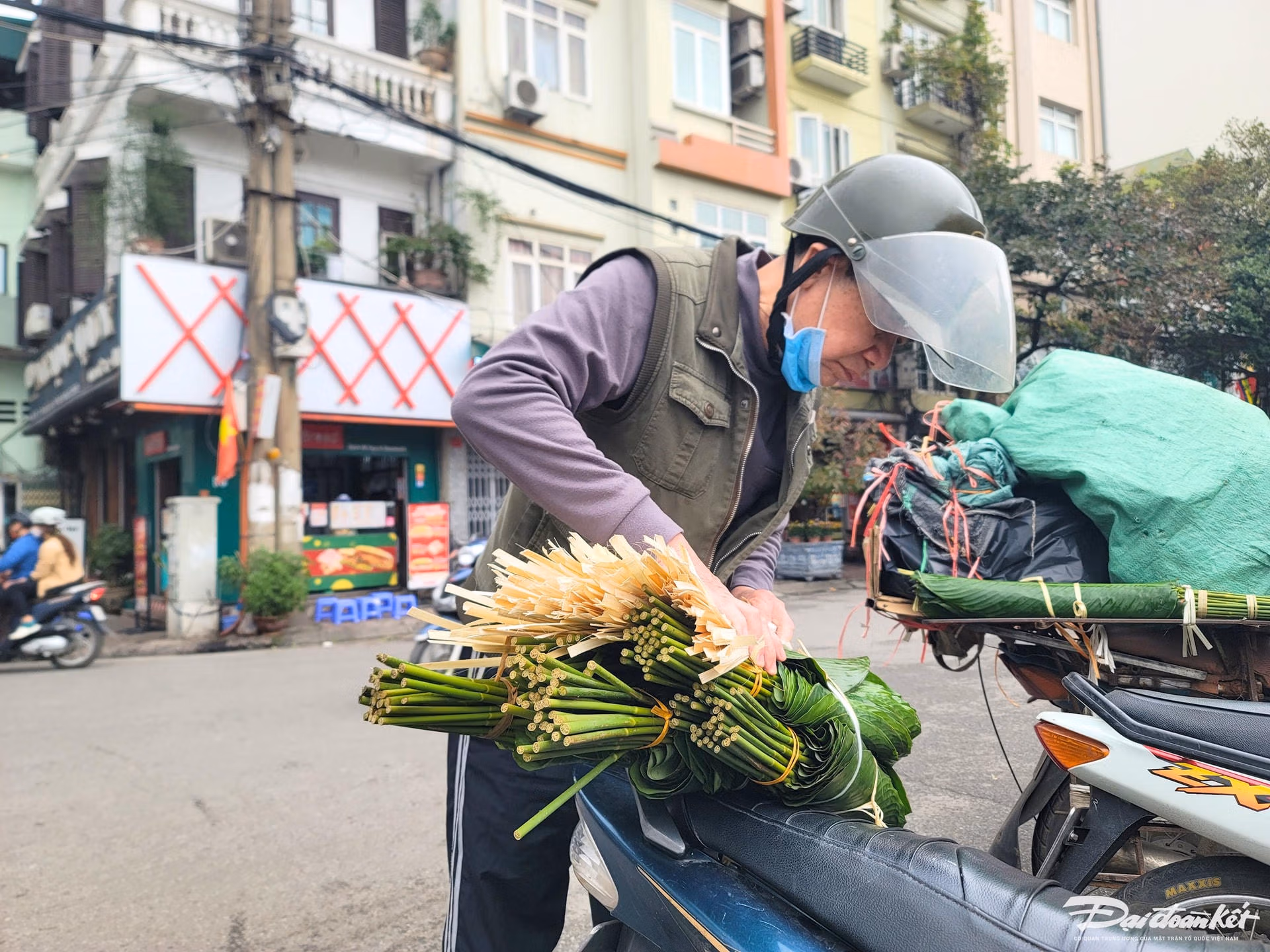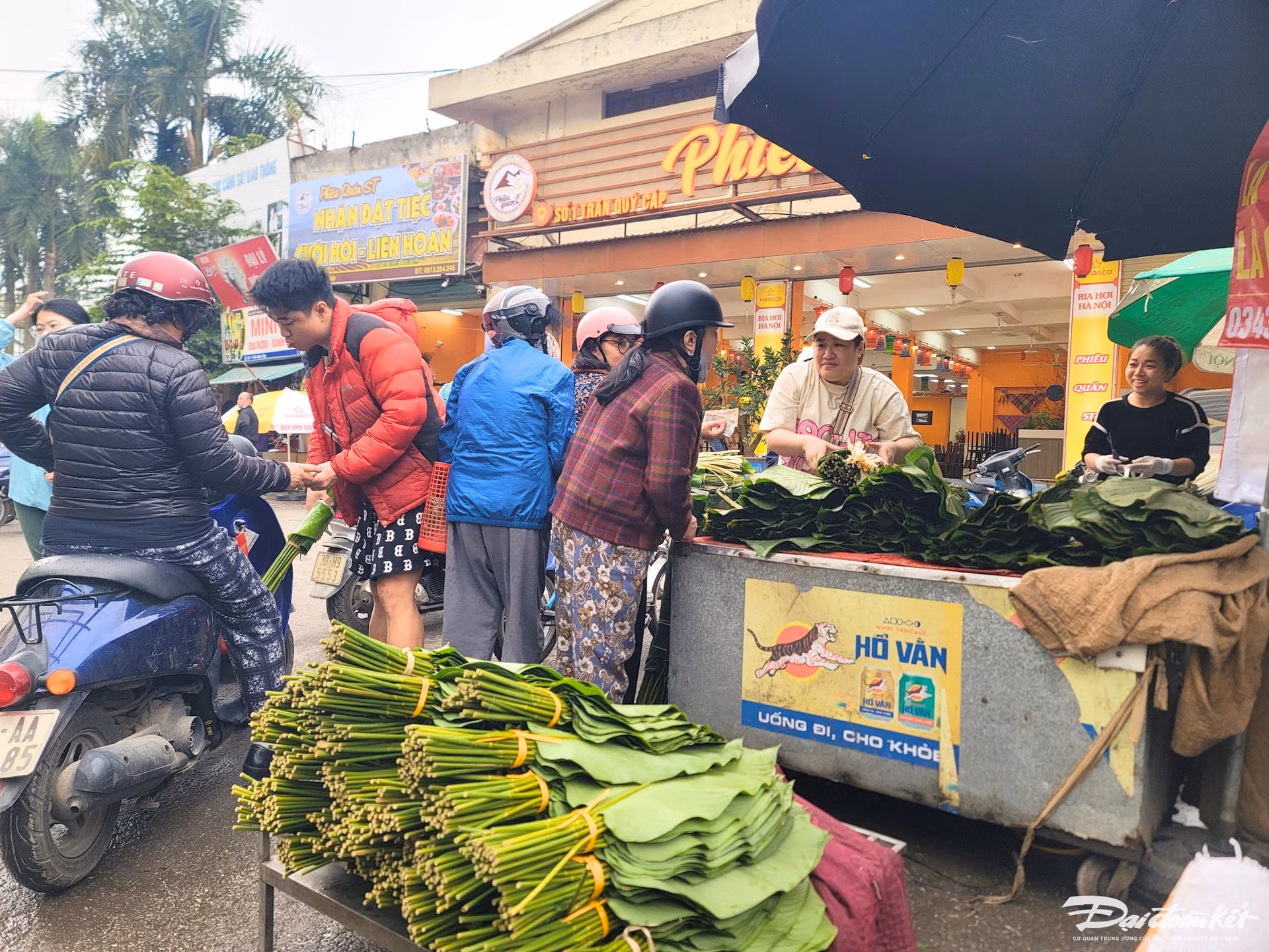 Những ngày cận Tết Nguyên đán 2024, phố Trần Quý Cáp (Đống Đa, Hà Nội) lại nhộn nhịp kẻ bán người mua hơn.Hình ảnh người dân tấp nập mua sắm lá dong chuẩn bị gói bánh chưng, báo hiệu ngày Tết cổ truyền của dân tộc đã cận kề.