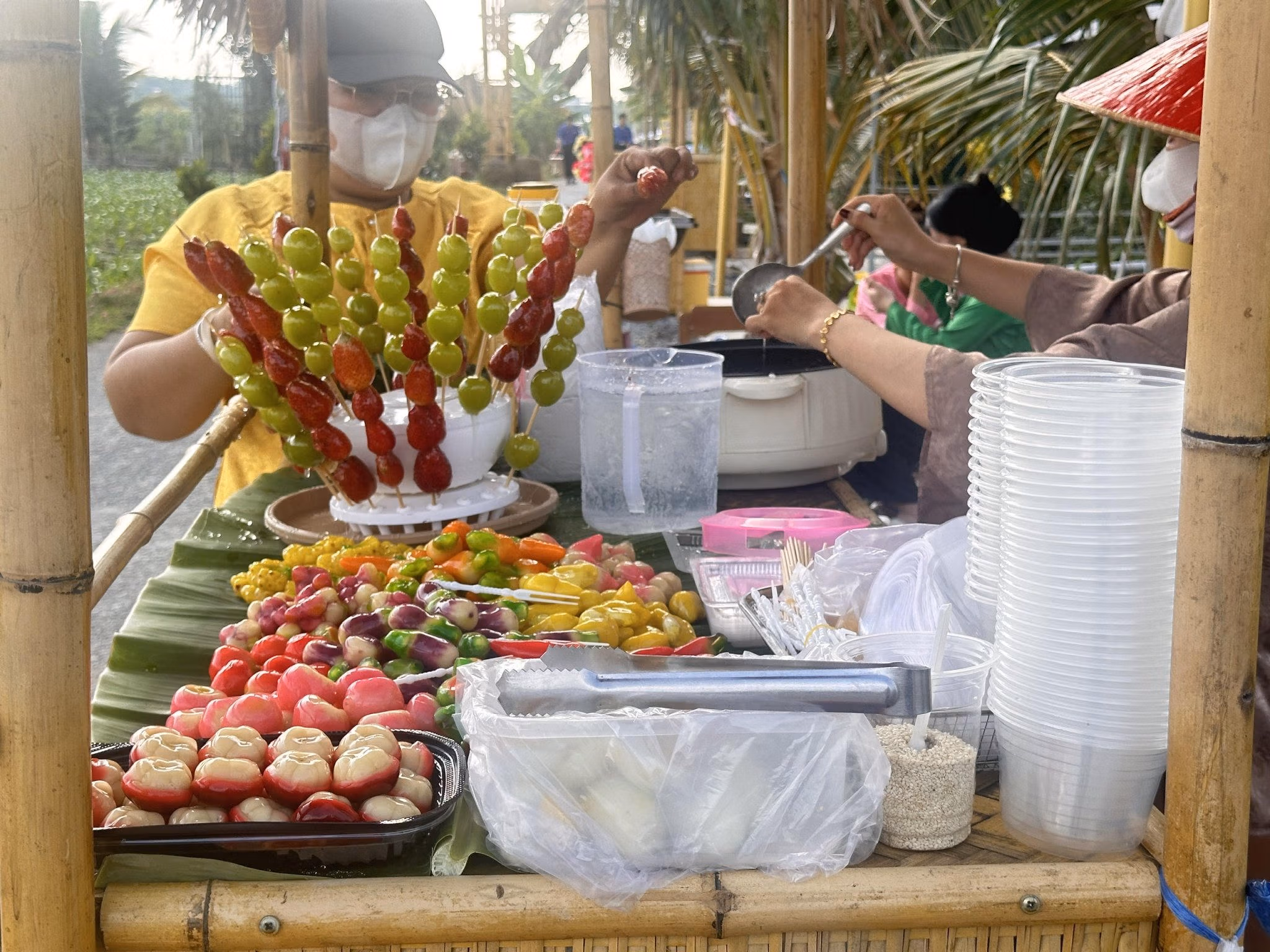 Chợ phiên Xóm Rẫy được tổ chức định kỳ vào chiều thứ Bảy hằng tuần tại khóm 14, nằm giữa cánh đồng thoáng đãng. Ngay từ lối vào, du khách đã cảm nhận rõ không khí làng quê Nam Bộ với những gian hàng dựng bằng tre, lá đơn sơ nhưng gần gũi. Từng sạp nhỏ bày bán rau củ, trái cây, bánh dân gian, nước uống truyền thống… tất cả đều là sản vật “cây nhà lá vườn” do chính tay người dân làm ra.