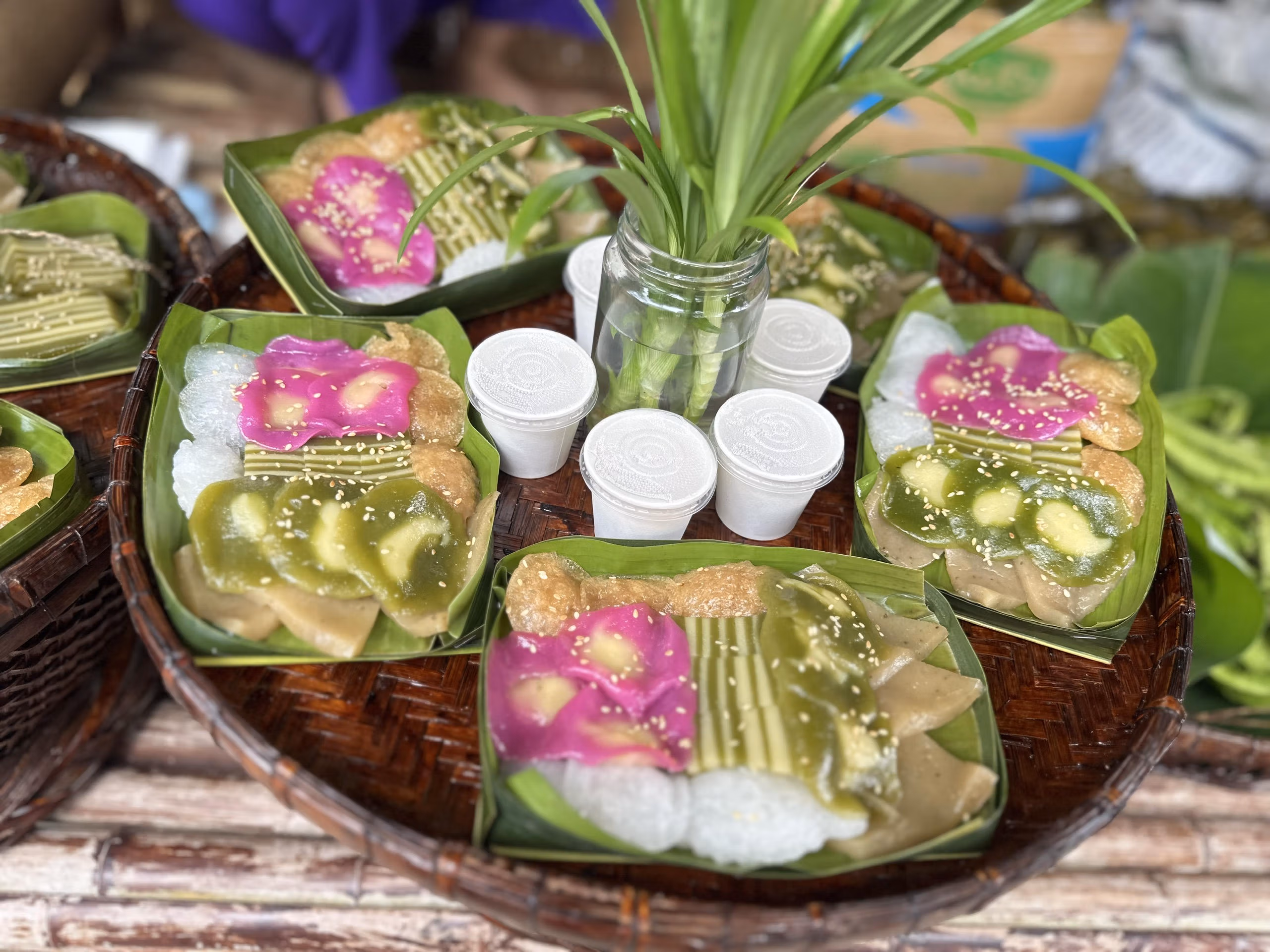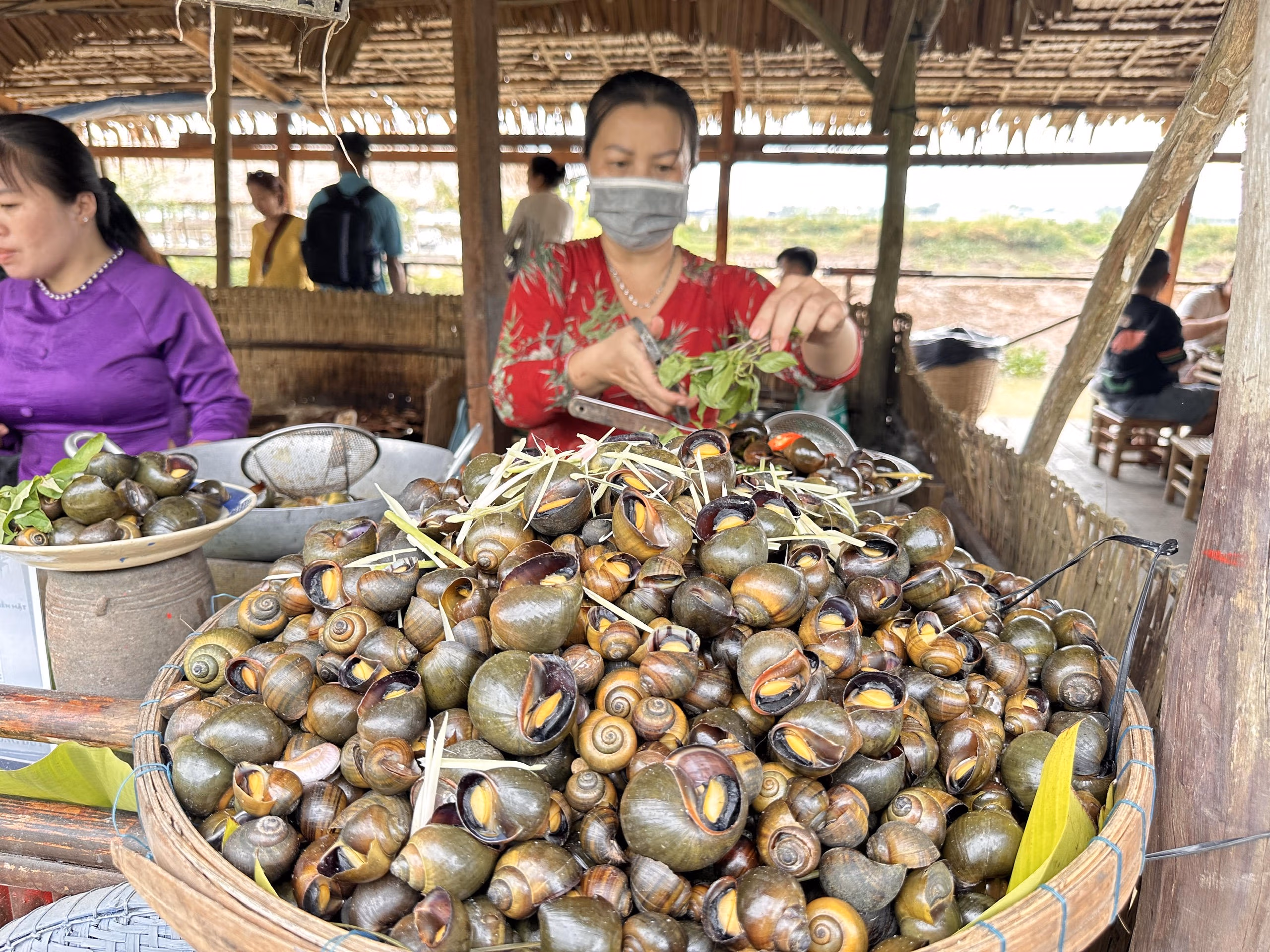 Không gian ẩm thực là điểm nhấn đặc biệt, thu hút đông đảo du khách. Những món bánh dân gian quen thuộc như bánh xèo, bánh khọt, bánh lá mít, bánh bò, bánh da lợn, bánh đúc, bánh tầm… được chế biến ngay tại chỗ, giữ trọn hương vị truyền thống. Bên cạnh đó là các món nướng dân dã như cá lóc nướng trui, tôm nướng, chuối nướng, ốc luộc sả ớt… tạo nên bức tranh ẩm thực miền Tây vừa giản dị, vừa hấp dẫn.