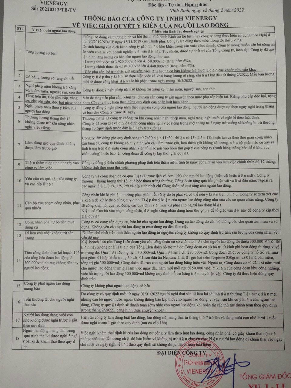 6 ý kiến trên, Công ty Vienergy giải thích đã và đang thực hiện theo quy định của pháp luật hiện hành, sẽ tiếp tục thực hiện tốt theo các quy định của Bộ luật Lao động trong thời gian tới.