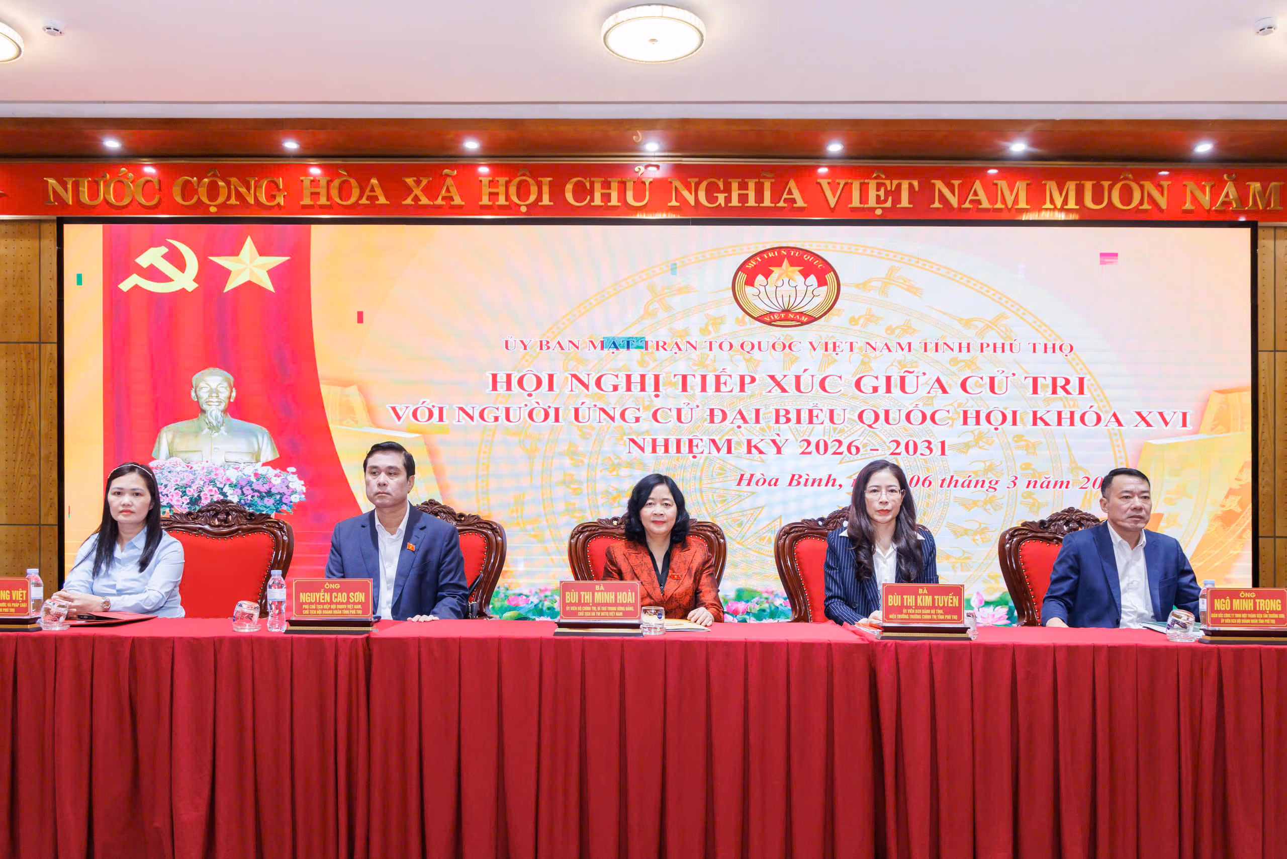 Sáng 6/3, Ủy viên Bộ Chính trị, Bí thư Trung ương Đảng, Bí thư Đảng ủy MTTQ, các đoàn thể Trung ương, Chủ tịch UBTƯ MTTQ Việt Nam Bùi Thị Minh Hoài cùng các ứng cử viên ứng cử Đại biểu Quốc hội khóa XVI, nhiệm kỳ 2026 – 2031, đơn vị bầu cử số 05 đã tiếp xúc cử tri trực tiếp tại UBND phường Hòa Bình và trực tuyến tại một số điểm cầu của tỉnh Phú Thọ.