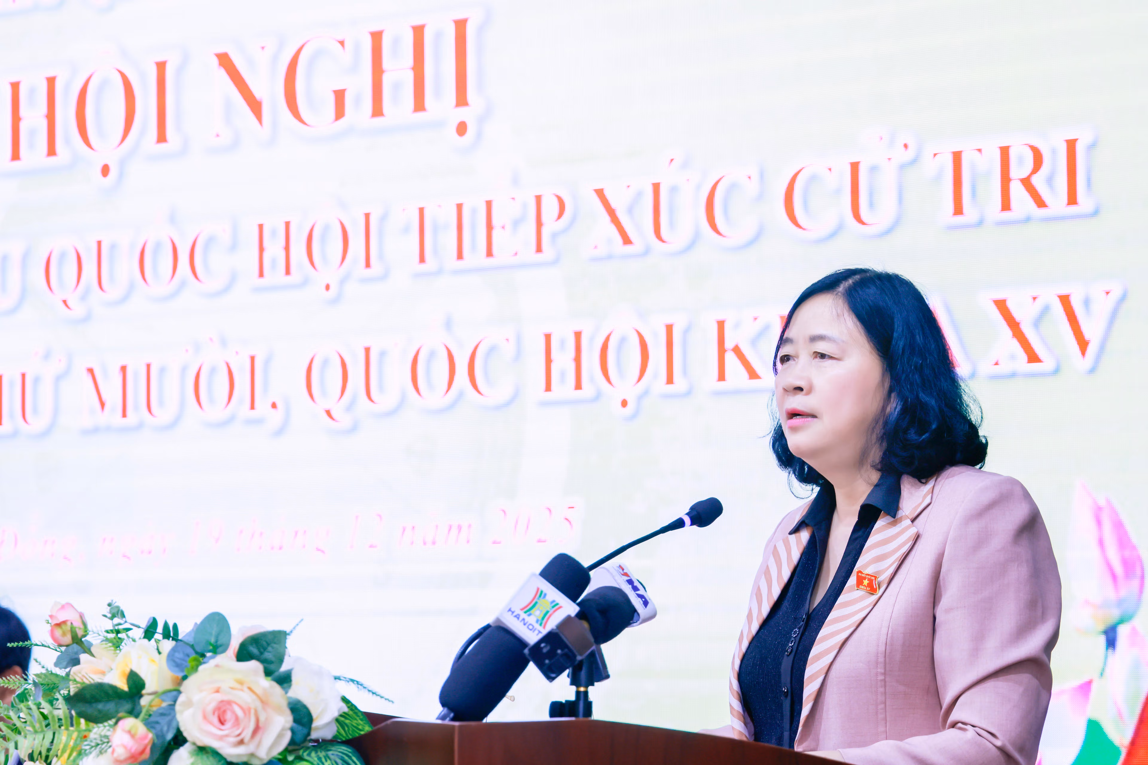 "Những ý kiến của các cử tri nêu tại Hội nghị sẽ được Tổ đại biểu Quốc hội Đơn vị bầu cử số 4 ghi chép đầy đủ, báo cáo với lãnh đạo các sở, ban, ngành, đoàn thể thành phố Hà Nội và địa phương để chủ động tháo gỡ, đáp ứng yêu cầu, đề xuất của cử tri", Chủ tịch Bùi Thị Minh Hoài nhấn mạnh.
