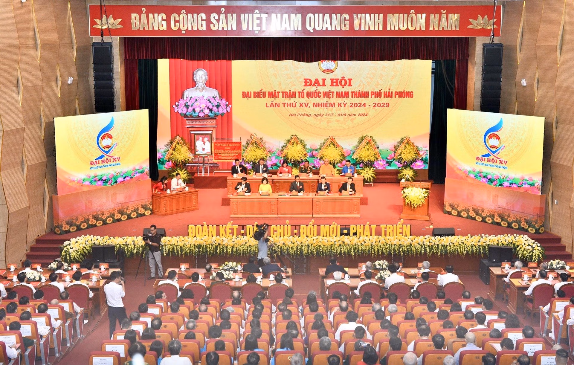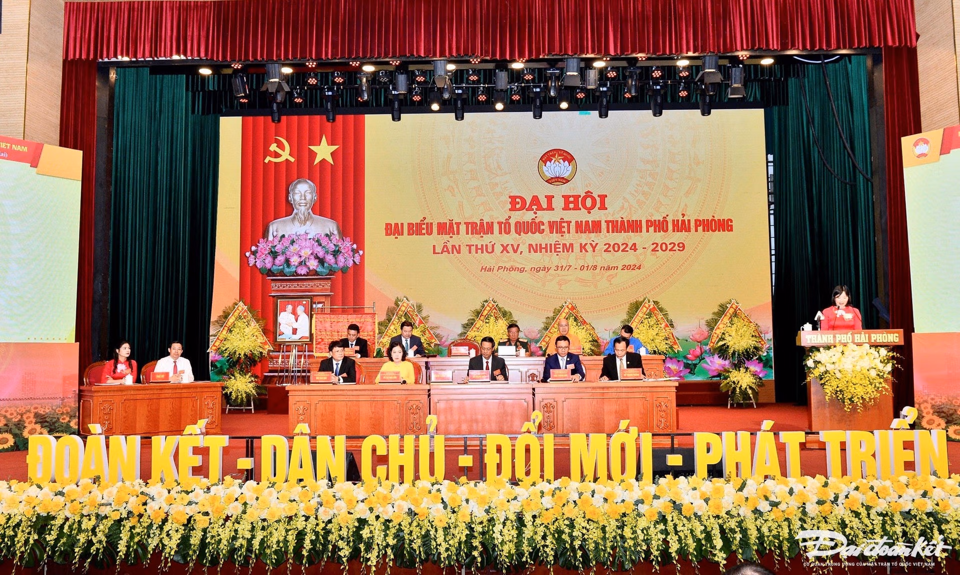 Chủ tịch Đỗ Văn Chiến dự Đại hội Đại biểu MTTQ TP Hải Phòng Thứ Năm 01/08/2024 09:23 (GMT+7) Sáng 1/8, Ủy viên Bộ Chính trị, Bí thư Trung ương Đảng, Chủ tịch UBTƯ MTTQ Việt Nam Đỗ Văn Chiến đã dự, chỉ đạo Đại hội đại biểu MTTQ Việt Nam TP Hải Phòng lần thứ XV, nhiệm kỳ 2024 - 2029. Ủy viên Bộ Chính trị, Bí thư Trung ương Đảng, Chủ tịch UBTƯ MTTQ Việt Nam Đỗ Văn Chiến; Ủy viên Trung ương Đảng, Bí thư Thành ủy Hải Phòng Lê Tiến Châu cùng các đại biểu tiến vào hội trường, dự Đại hội đại biểu MTTQ Việt Nam TP Hải Phòng lần thứ XV, nhiệm kỳ 2024 - 2029.Ủy viên Bộ Chính trị, Bí thư Trung ương Đảng, Chủ tịch UBTƯ MTTQ Việt Nam Đỗ Văn Chiến cùng các đại biểu tiến hành nghi thức chào cờ.Cùng dự Đại hội còn có ông Lê Tiến Châu, Ủy viên Trung ương Đảng, Bí thư Thành ủy, Trưởng Đoàn đại biểu Quốc hội TP Hải Phòng; ông Nguyễn Văn Tùng, Chủ tịch UBND TP Hải Phòng và các lãnh đạo, nguyên lãnh đạo TP Hải Phòng; Mẹ Việt Nam Anh hùng, Anh hùng lực lượng vũ trang, Anh hùng lao động thời kỳ đổi mới; Đoàn đại biểu Ủy ban MTTQ các địa phương Hà Nội, TP Hồ Chí Minh, Cần Thơ, Đà Nẵng, Thái Bình, Hải Dương, Sơn La cùng 279 đại biểu chính thức đại diện cho các các tầng lớp nhân dân, các giai cấp, các dân tộc, các tôn giáo, nhân sĩ, trí thức, doanh nhân trên địa bàn TP Hải Phòng.Toàn cảnh Đại hội đại biểu MTTQ Việt Nam TP Hải Phòng lần thứ XV, nhiệm kỳ 2024 - 2029.Đoàn Chủ tịch điều hành Đại hội đại biểu MTTQ Việt Nam TP Hải Phòng lần thứ XV, nhiệm kỳ 2024 - 2029. Ngọc Anh - Phương Thanh