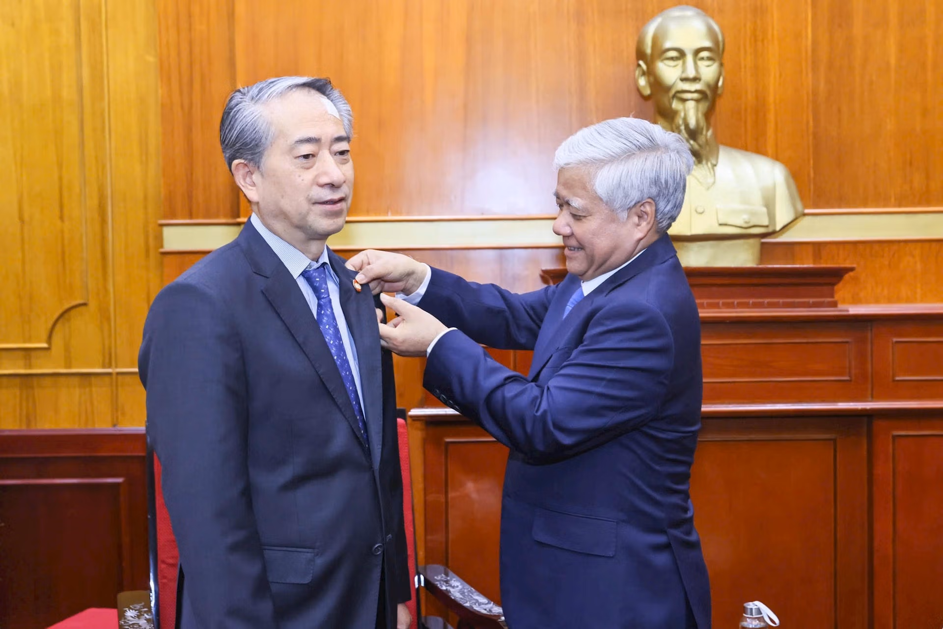 Chủ tịch Đỗ Văn Chiến bày tỏ niềm vui mừng tiếp Đại sứ Hùng Ba tại UBTƯ MTTQ Việt Nam trước khi Đại sứ chuẩn bị về nước, kết thúc nhiệm kỳ công tác tại Việt Nam.