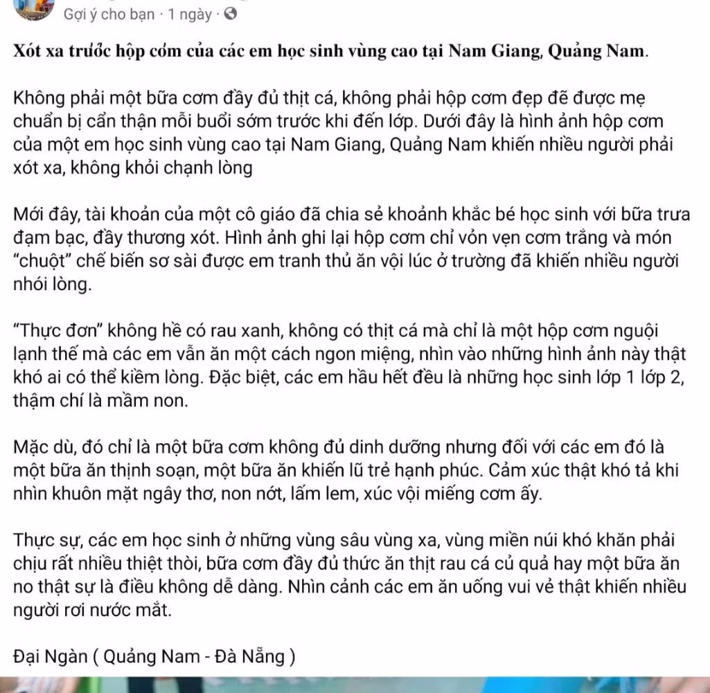 Trước đó, những ngày qua, bức ảnh hộp cơm chứa cơm trắng cùng thịt chuột gây xôn xao mạng xã hội. Nhiều ý kiến bày tỏ sự xót thương trước bữa ăn được cho là đạm bạc của học sinh ở vùng cao Quảng Nam. Bên cạnh đó, không ít ý kiến cho rằng đây là món ăn rất đỗi bình thường của bà con địa phương.