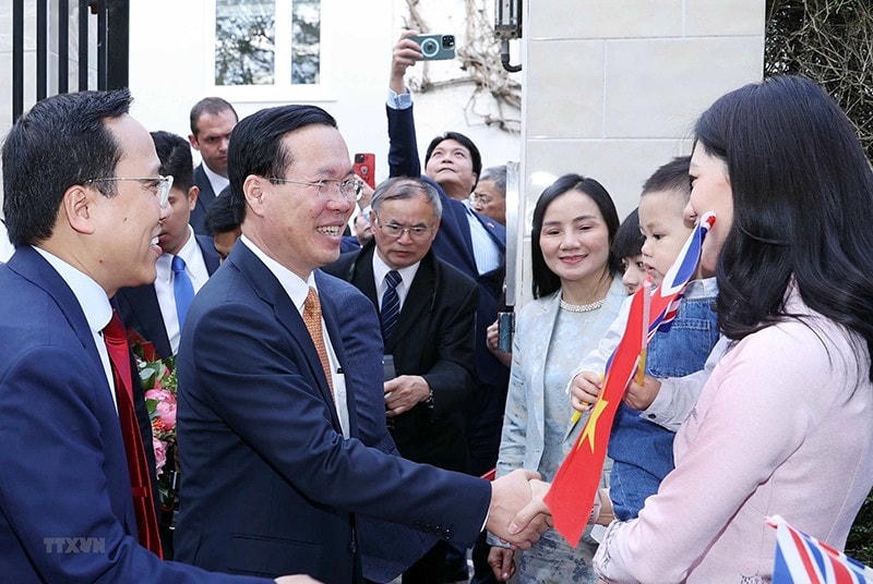 Chiều tối 5/5 (giờ địa phương), ngay sau khi đến thủ đô London, Chủ tịch nước Võ Văn Thưởng đã tới thăm cán bộ, nhân viên Đại sứ quán và gặp gỡ cộng đồng người Việt Nam tại Vương quốc Anh.