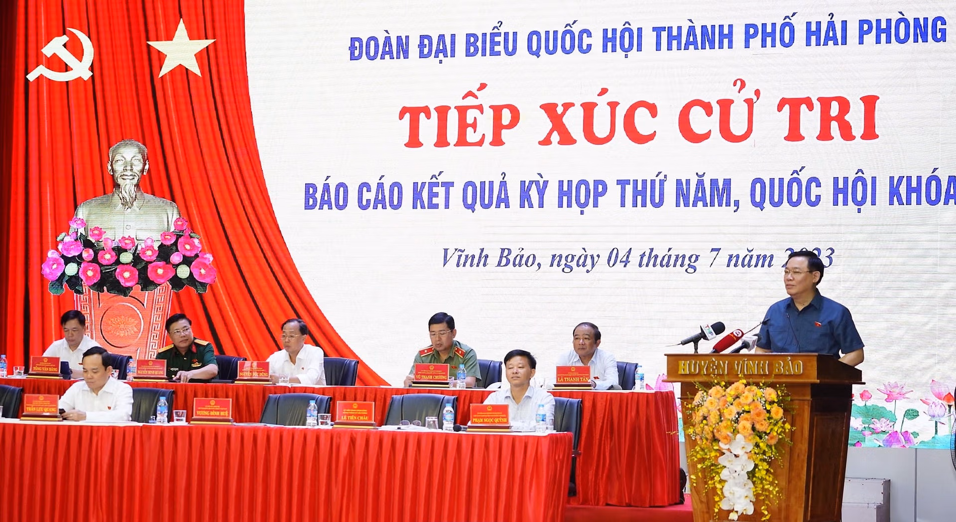 Ngày 4/7, tại huyện Vĩnh Bảo (TP Hải Phòng), Ủy viên Bộ Chính trị, Chủ tịch Quốc hội Vương Đình Huệ cùng Đoàn ĐBQH TP Hải Phòng đã tiếp xúc cử tri báo cáo kết quả Kỳ họp thứ Năm, Quốc hội Khoá XV.