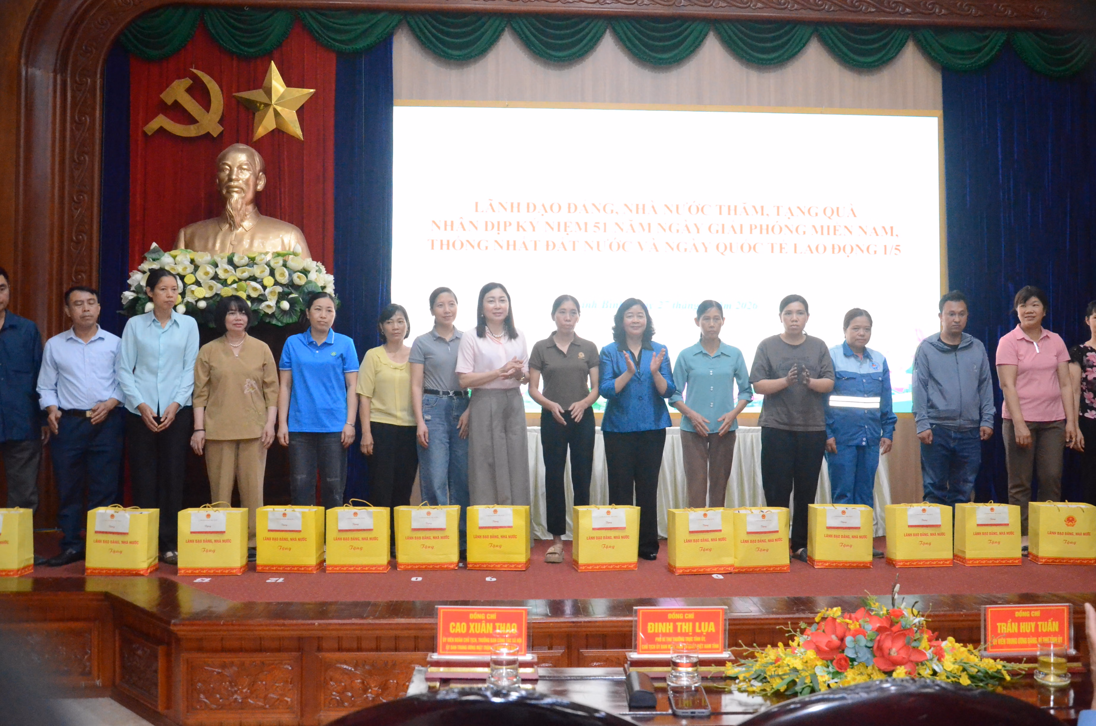 Thay mặt lãnh đạo Đảng, Nhà nước, Chủ tịch Ủy ban Trung ương MTTQ Việt Nam Bùi Thị Minh Hoài đã thăm hỏi, tặng quà một số gia đình chính sách, công nhân, người lao động tại tỉnh Ninh Bình nhân kỷ niệm 51 năm Ngày giải phóng miền Nam, thống nhất đất nước và Ngày Quốc tế Lao động.
