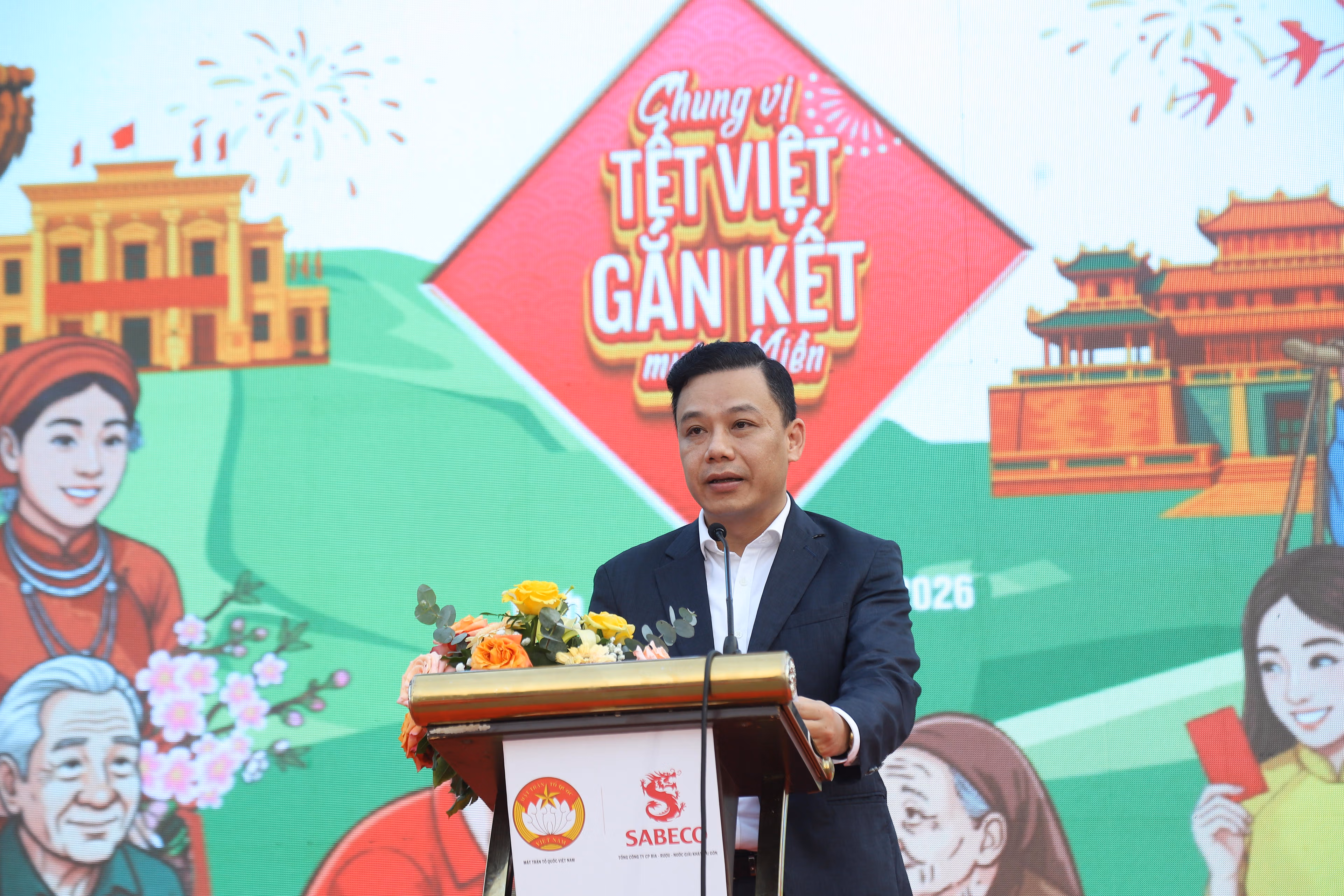 Phát biểu tại buổi lễ ông Lò Trung Kiên, Phó Trưởng ban Công tác xã hội Ủy Ban Trung ương MTTQ Việt Nam cho biết: Chương trình “Chung vị tết Việt, gắn kết muôn miền” do Ủy ban Trung ương MTTQ Việt Nam phối hợp cùng Sabeco tổ chức sẽ trao quà cho 6.500 hộ gia đình ngư dân, công nhân lao động gặp khó khăn do thiên tai bão lũ vừa mới đi qua và các chiến sĩ đồn biên phòng vùng biển và vùng biên giới tại 16 tỉnh, thành phố trong cả nước.