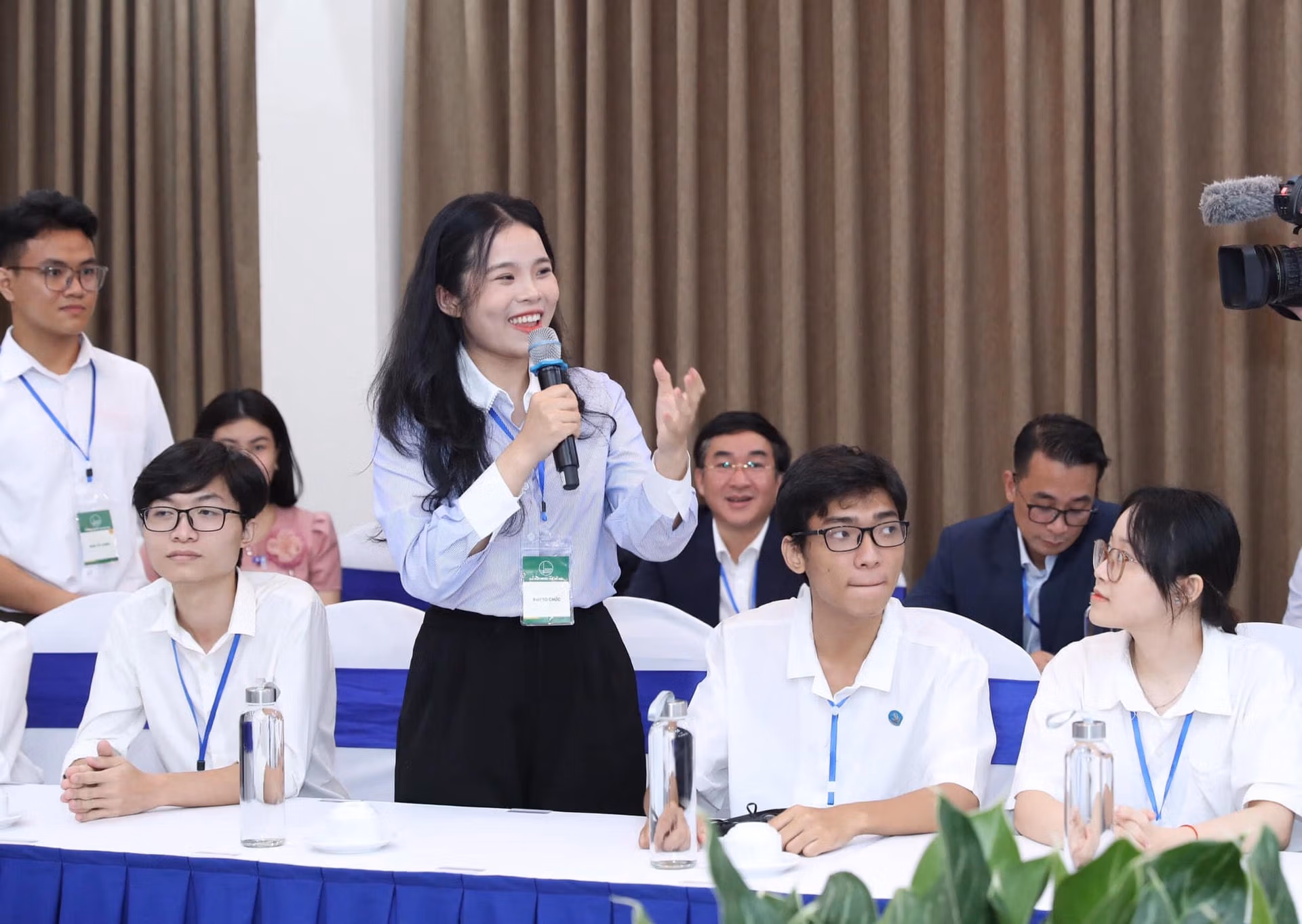 Em Vũ Thu Hằng, sinh viên Trường Đại học Ngoại ngữ, đặt câu hỏi: "Chúng cháu cần tiêu chuẩn thế nào về kiến thức, kỹ năng để đáp ứng yêu cầu nhân lực hiện nay trong bối cảnh trí tuệ nhân tạo phát triển?".