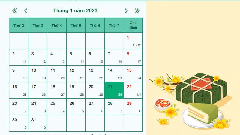 Cụ thể, ngày 30 Tết Quý Mão sẽ là ngày 21/1/2023 Dương lịch (Thứ 7) và ngày mùng 1 Tết Quý Mão sẽ là vào ngày 22/1/2023 Dương lịch (Chủ nhật).