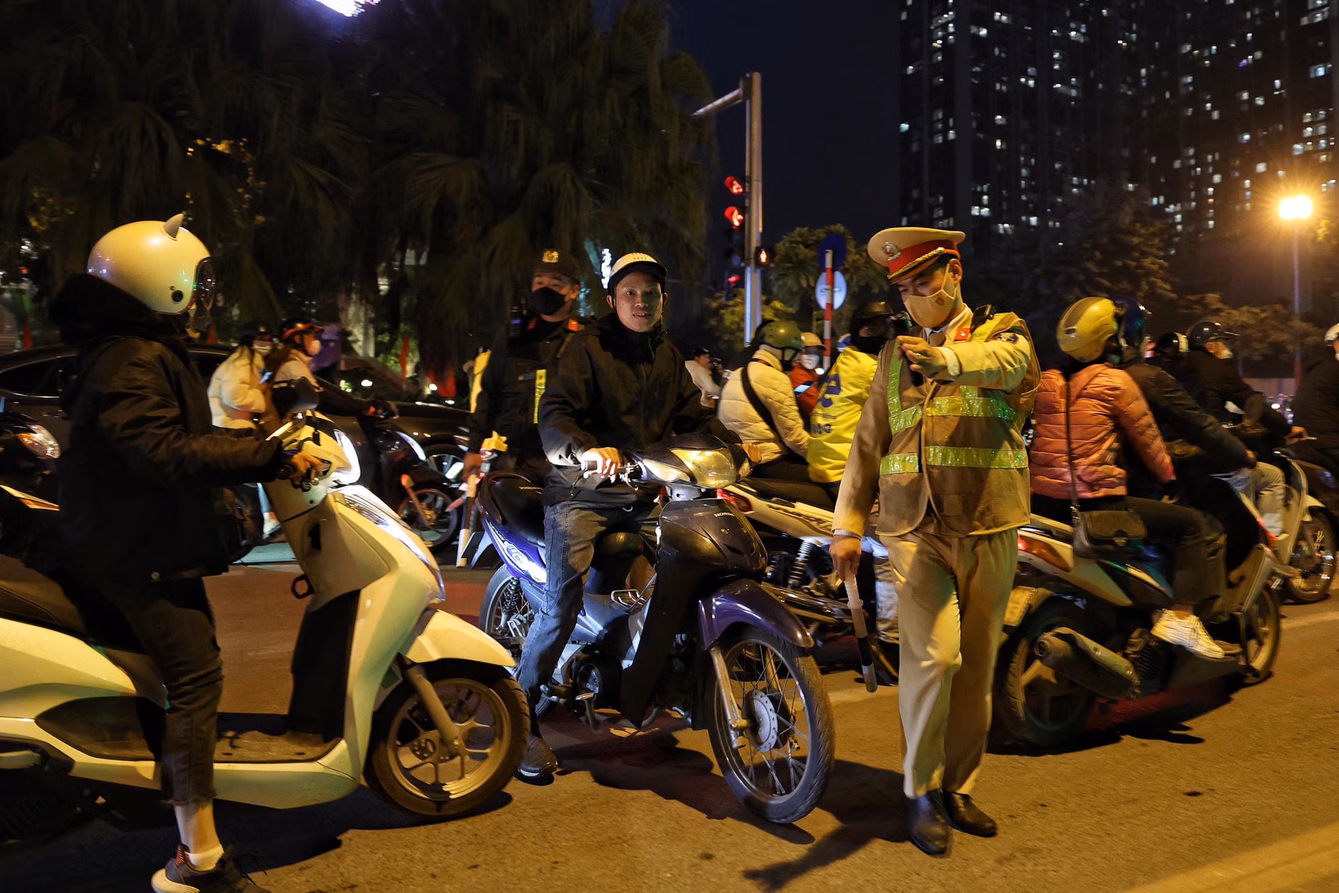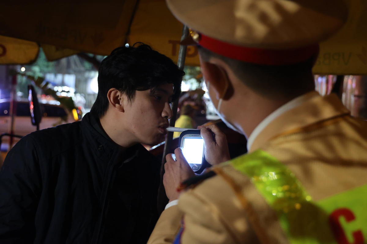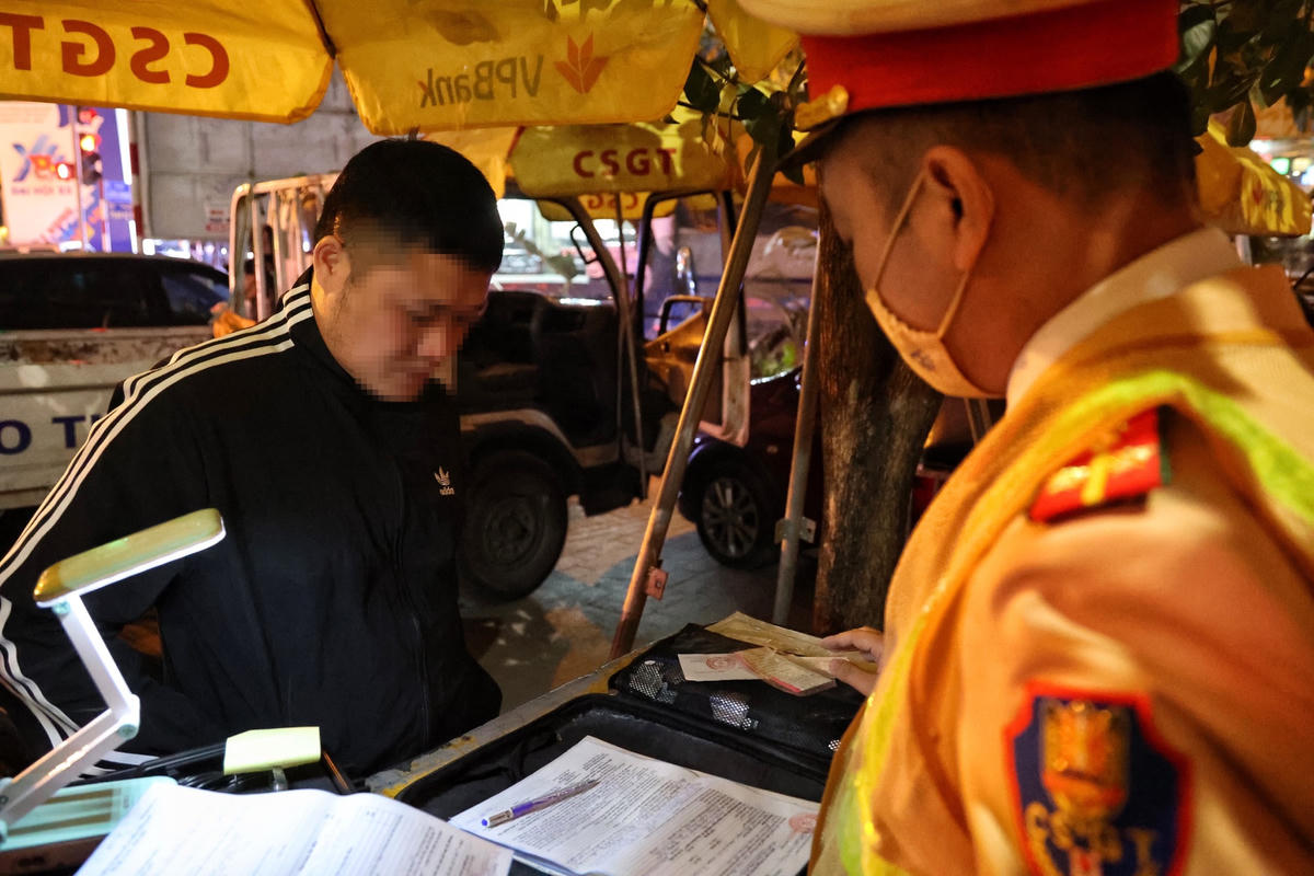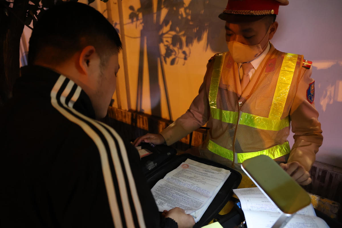 Tối 13/12, PV Báo Đại Đoàn Kết theo chân lực lượng liên ngành Y1/141 (Công an TP Hà Nội) làm nhiệm vụ tại nút giao Liễu Giai - Phan Kế Bính (Ba Đình, Hà Nội) để xử lý vi phạm nồng độ cồn.Chỉ ít phút sau khi lập chốt, tổ công tác phát hiện hàng loạt trường hợp người điều khiển phương tiện vi phạm kịch khung nồng độ cồn. Anh N.T.T điều khiển xe máy có biểu hiện bất thường đã bị tổ công tác yêu cầu dừng xe, kiểm tra. Qua kiểm tra kết quả, nồng độ cồn của anh T. là 0,503 mg/l khí thở. Đây là mức nồng độ cồn rất cao, so với mức vi phạm tối đa được quy định tại Nghị định 100/NĐ-CP.Tương tự, Anh N.C.H. (Đống Đa, Hà Nội) điều khiển xe máy theo hướng từ Liễu Giai đi Nguyễn Chí Thanh bị tổ công tác yêu cầu dừng xe, kiểm tra. Kết quả nồng độ cồn của anh H. là 0,654 mg/l khí thở. Đây là mức nồng độ cồn rất cao, gấp 1,6 lần mức vi phạm tối đa được quy định tại Nghị định 100/NĐ-CP.Với lỗi vi phạm trên, tài xế N.C.H. bị lực lượng CSGT lập biên bản xử phạt 7 triệu đồng, tước giấy phép lái xe 23 tháng và tạm giữ phương tiện 7 ngày.Bên cạnh đó, tổ công tác còn liên tiếp xử lý nhiều vi phạm do không đội mũ bảo hiểm, điều khiển xe mô tô đèo ba, lạng lách.Đáng chú ý, có nhiều đối tượng điều khiển xe khi chỉ 15 tuổi, không đội mũ bảo hiểm và sử dụng biển số giả; một số khác vẫn điều khiển phương tiện tham gia giao thông sau khi uống rượu, bia.Đặc biệt, do nhìn thấy lực lượng chức năng nhiều đối tượng ngang nhiên quay xe bỏ chạy gây mất ATGT cũng bị lực lượng chức năng đón lõng xử lý nghiêm.Trung tá Nguyễn Ngọc Thuyên, Phó Đội trưởng Đội Cảnh sát giao thông số 1, Phòng CSGT Công an TP Hà Nội cho biết, thực hiện cao điểm tấn công, trấn áp tội phạm, đảm bảo an ninh trật tự, an toàn xã hội dịp Tết Nguyên đán, trong 2 giờ đồng hồ trực chốt kiểm tra hành chính, các tổ công tác 141 Công an TP Hà Nội đã liên tiếp phát hiện nhiều trường hợp vi phạm kịch khung nồng độ cồn. Đáng chú ý, nhiều lái xe khi thấy lực lượng 141 đã cố tình quay đầu bỏ chạy, có trường hợp gây tai nạn cho người đi đường.Trung tá Nguyễn Ngọc Thuyên cho biết thêm, có không ít các trường hợp khi thấy tổ công tác đã quay đầu bỏ chạy gây mất an toàn cho chính người điều khiển phương tiện, người tham gia giao thông khác và lực lượng chức năng. "Các trường hợp thanh niên trẻ, khi nhìn thấy lực lượng chức năng sinh ra tâm lý sợ hãi nên bỏ chạy. Với thanh niên ngổ ngáo, xăm trổ, có dấu hiệu nghi vấn, lực lượng công tác sẽ bố trí đón lõng, chặn bắt. Tuy nhiên lực lượng cũng bố trí lực lượng để làm sao vừa bắt được đối tượng nhưng vừa đảm bảo an toàn cho người dân tham gia trên đường cũng như lực lượng chức năng", Trung tá Thuyên nhấn mạnh.Lực lượng chức năng lập biên bản đối với các trường hợp vi phạm.