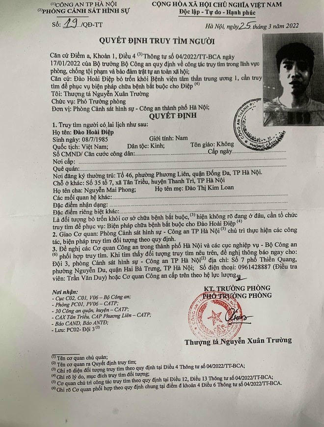 Theo cơ quan công an, Điệp là đối tượng bỏ trốn khỏi cơ sở chữa bệnh bắt buộc, hiện không rõ đang ở đâu, cần truy tìm để phục vụ biện pháp chữa bệnh bắt buộc.