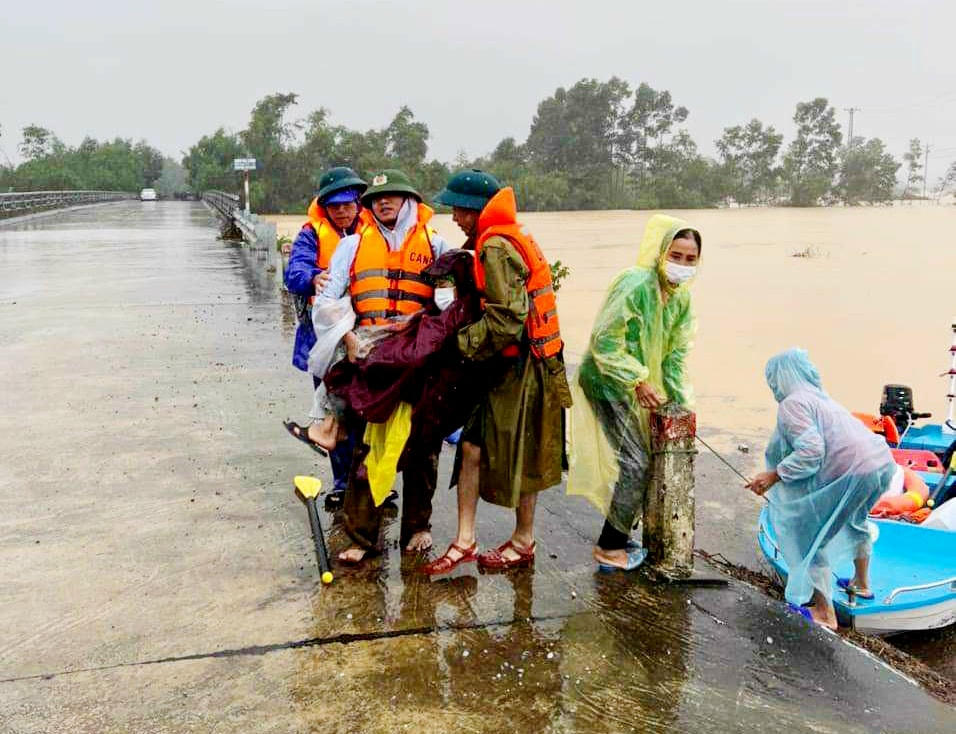 Lực lượng công an xã vừa giúp một bệnh nhân bị ung thư đang trong tình trạng nguy kịch vượt lũ ra khỏi nhà để đến bệnh viện điều trị.