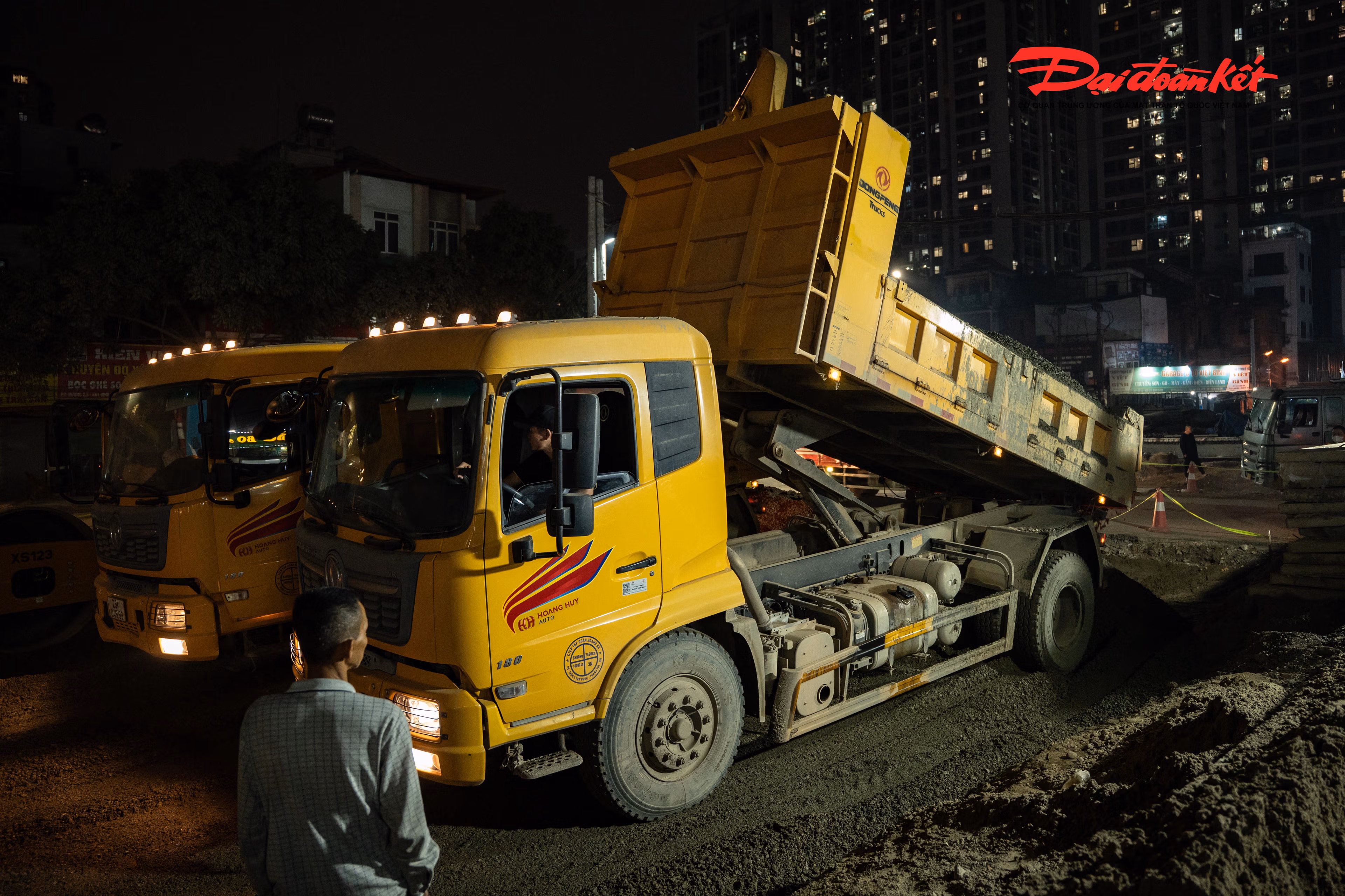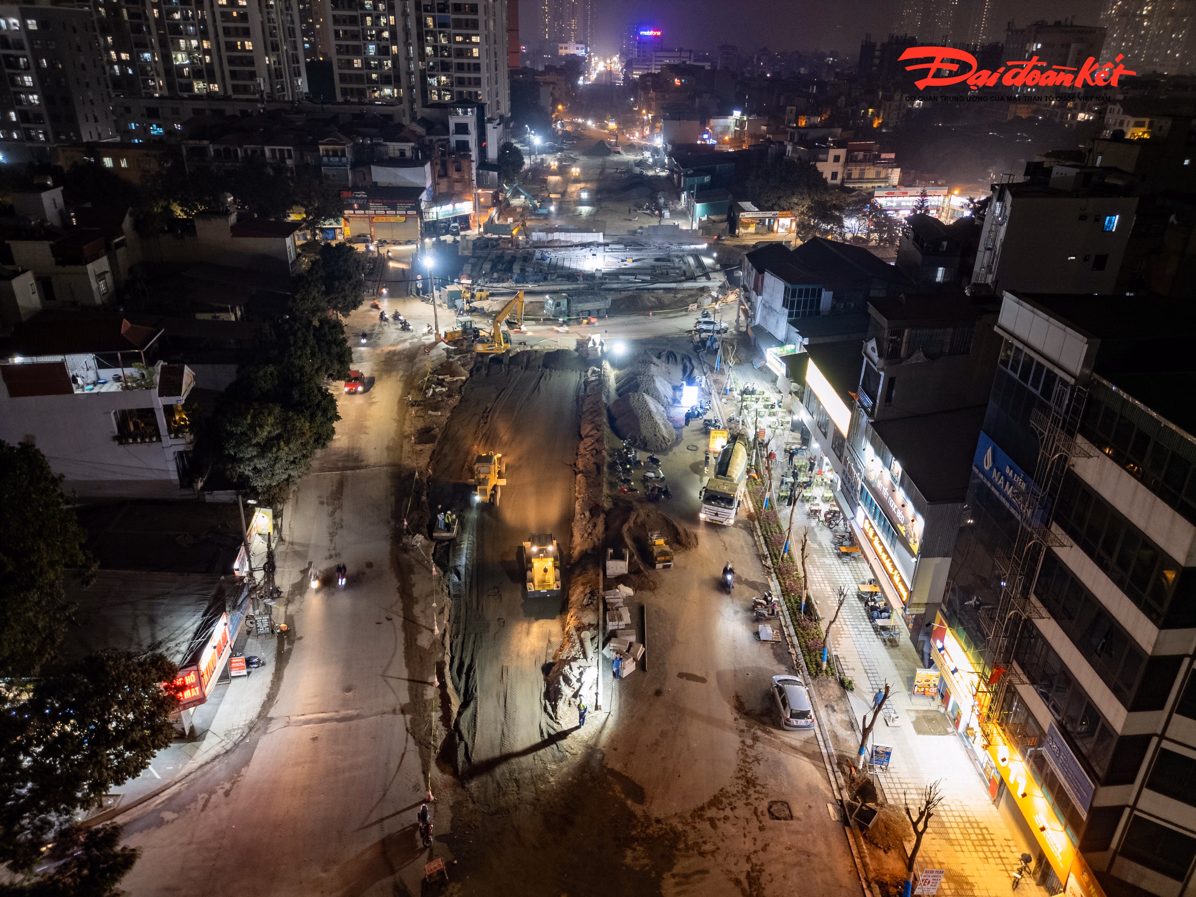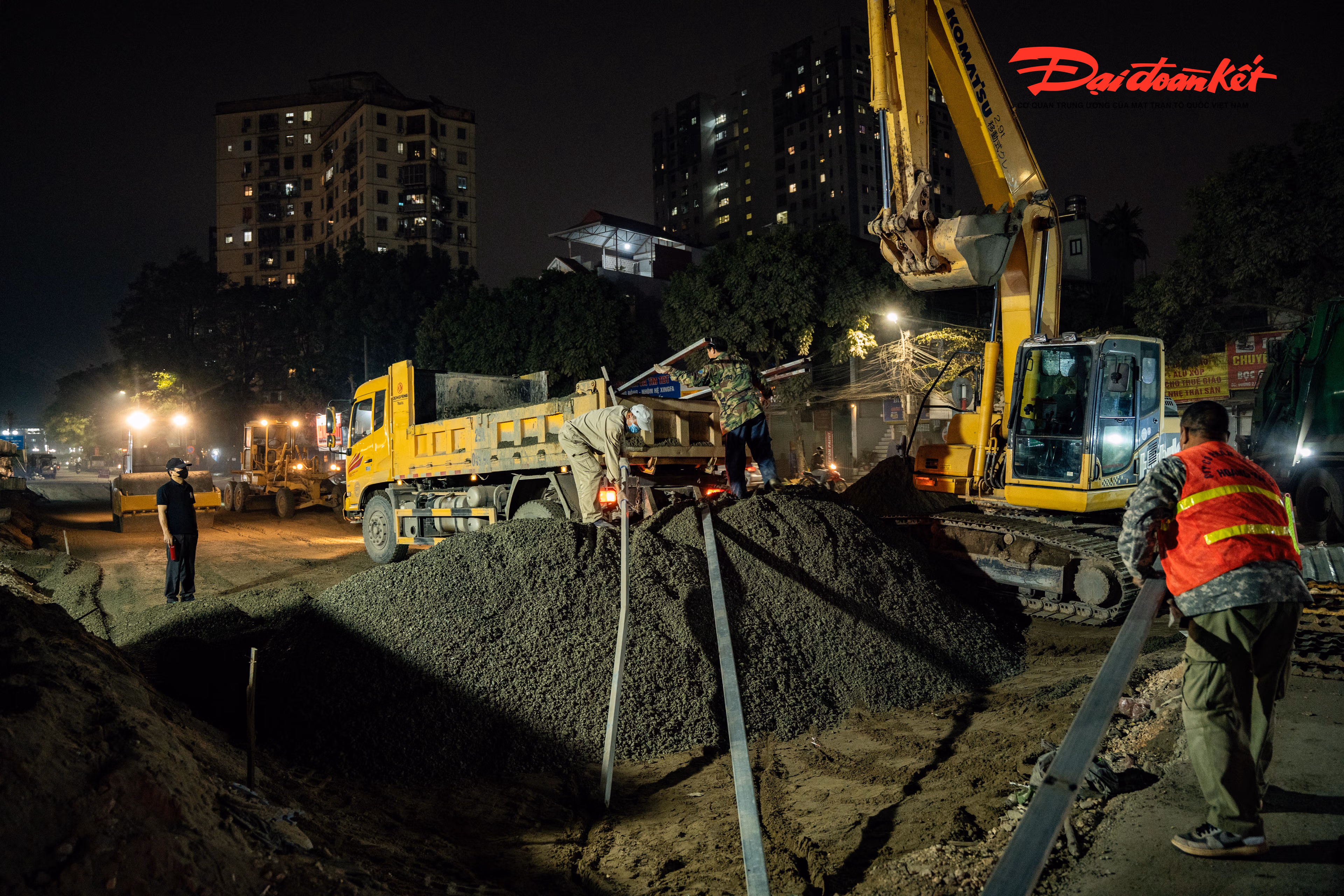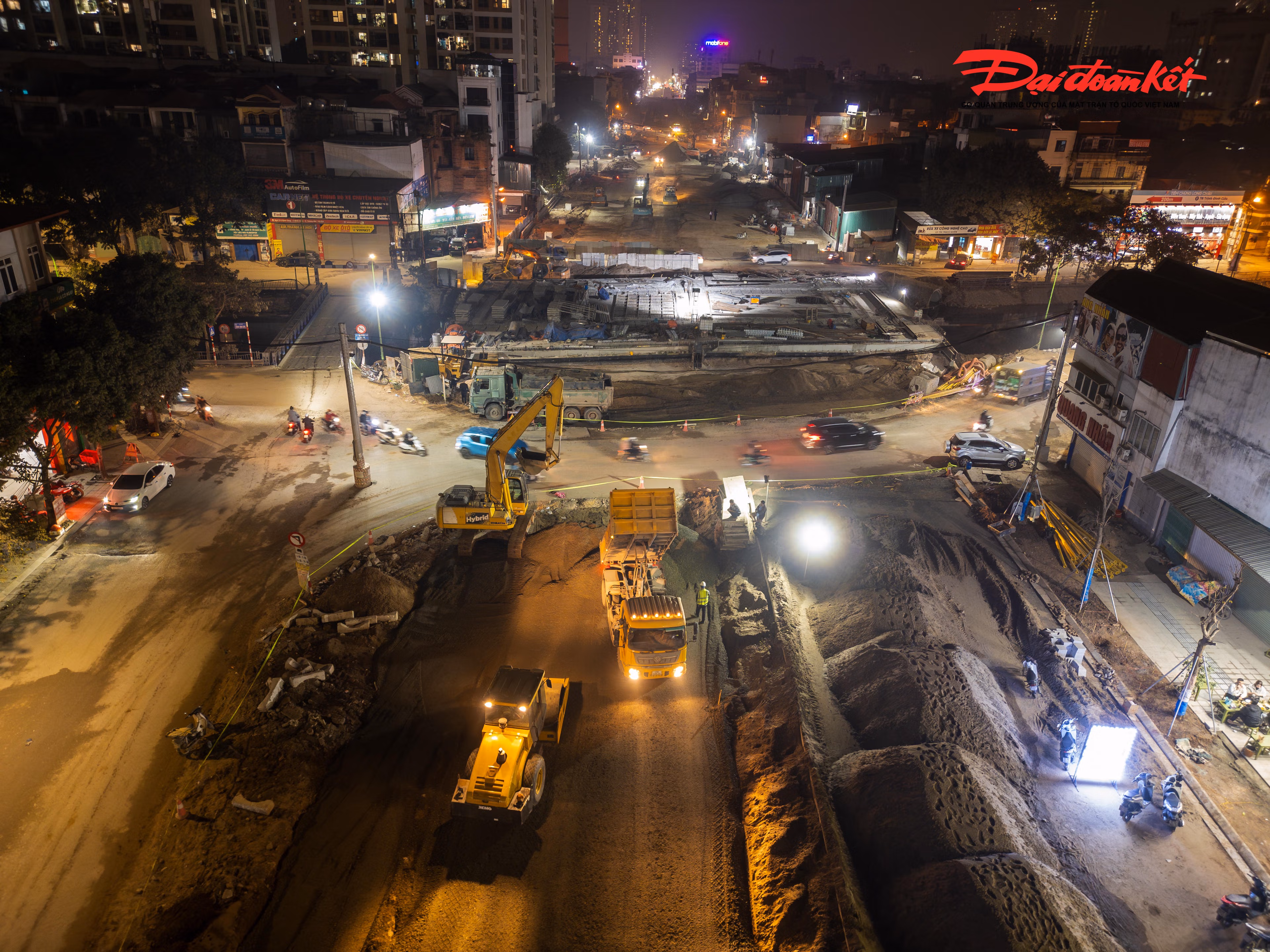Dưới ánh đèn công trường, từng nhóm công nhân miệt mài làm việc, áo phản quang nổi bật giữa sương đêm. Thời tiết Hà Nội rét buốt, song nhịp độ thi công gấp rút khiến không khí trên công trường luôn căng mình, khẩn trương.