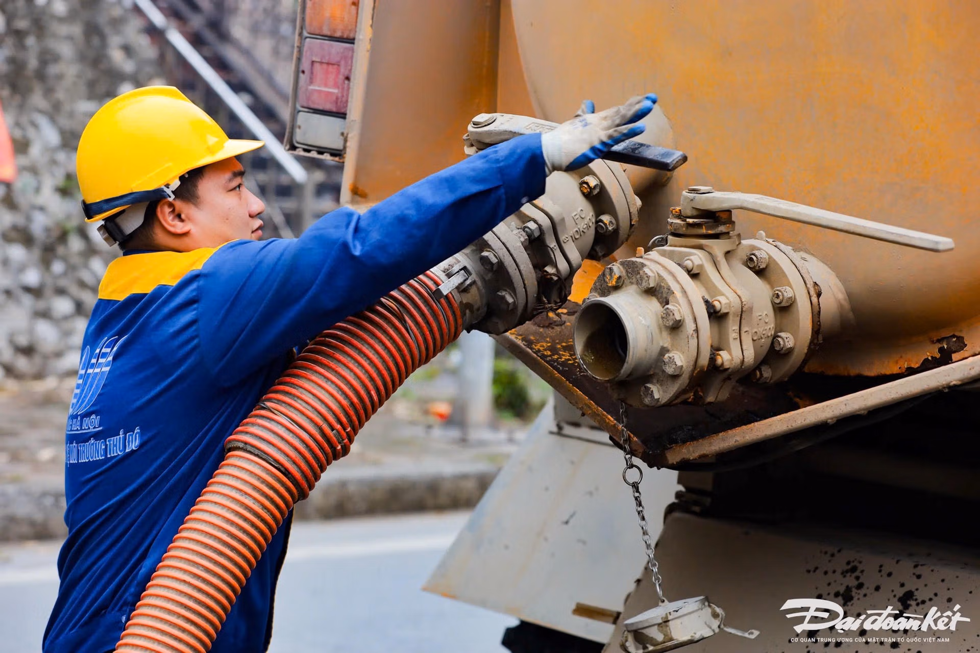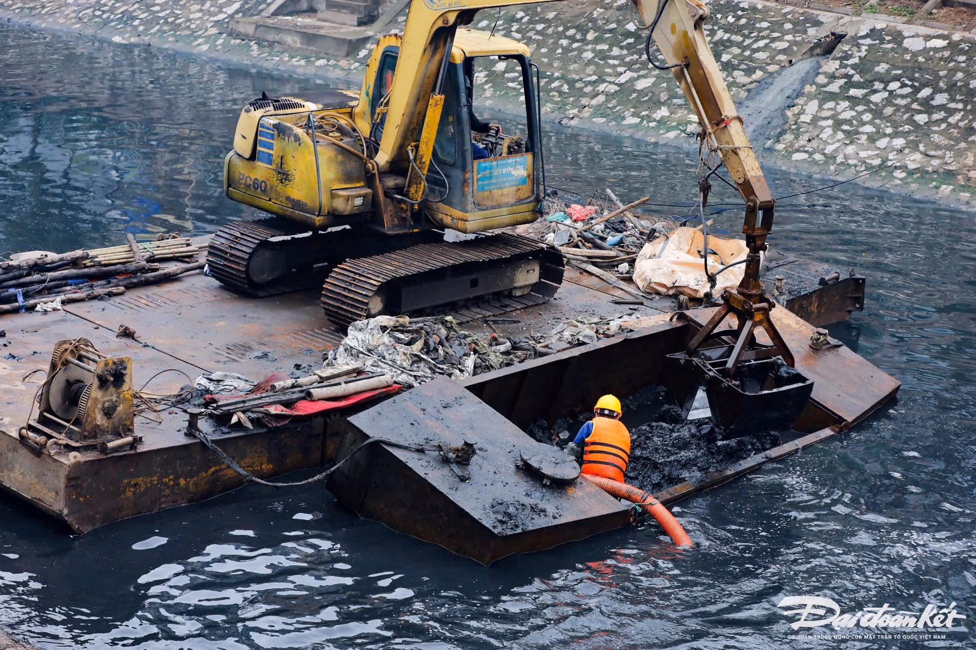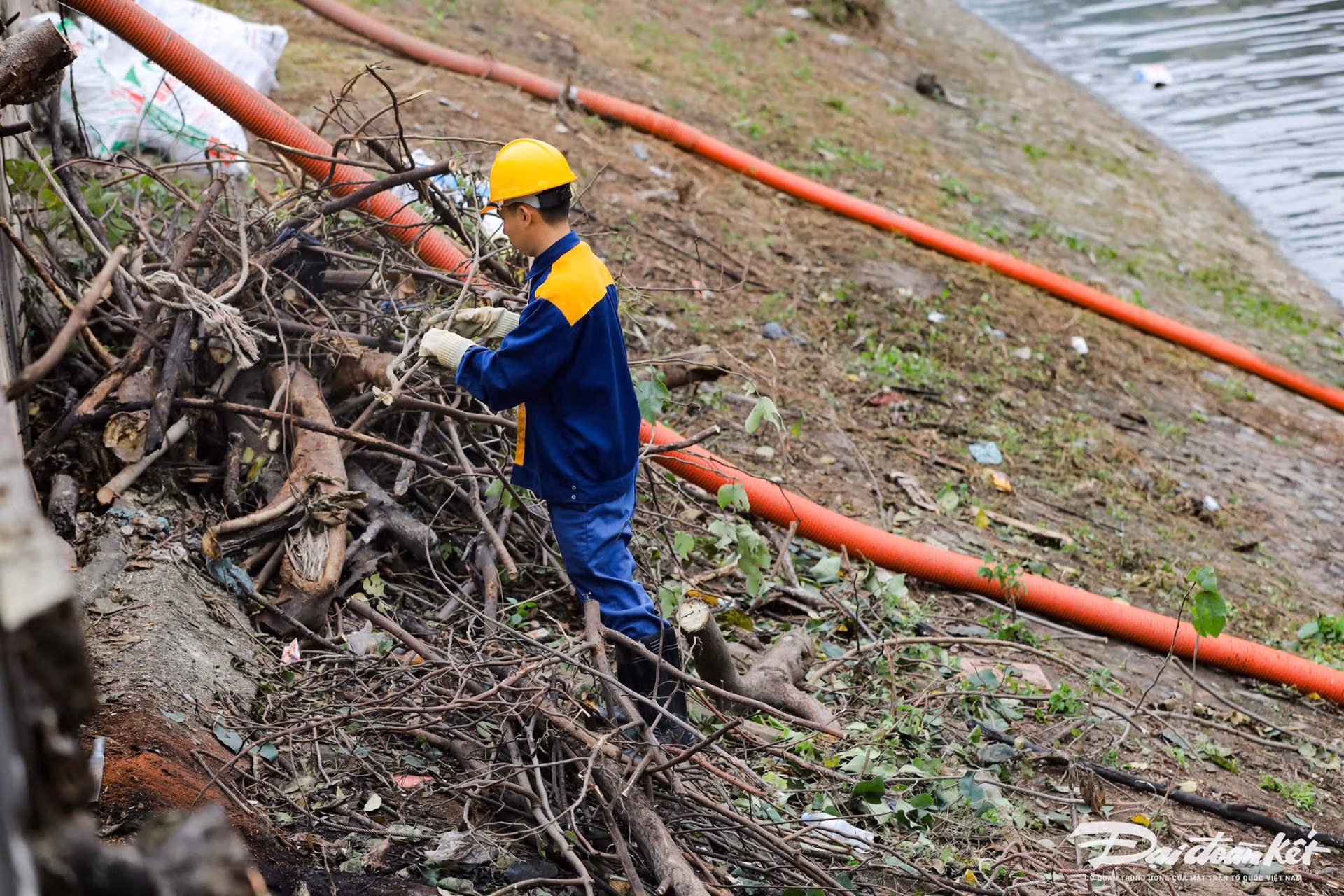 Công nhân thoát nước ngâm mình dưới dòng nước đen, nạo vét sông Tô Lịch Thứ Bảy 22/02/2025 14:04 (GMT+7) Công nhân ngâm mình dưới dòng nước thải đen sì, bốc mùi hôi thối để nạo vét bùn đất làm sạch sông Tô Lịch. Video công nhân nạo vét bùn sông Tô Lịch.Theo ghi nhận của PV Báo Đại Đoàn Kết trong ngày 21-22/2 tại khu vực đầu nguồn sông Tô Lịch nằm ở nút giao Hoàng Quốc Việt - Bưởi (quận Cầu Giấy), hàng chục công nhân Công ty Thoát nước Hà Nội đang tiến hành nạo vét bùn thải trên sông, khơi thông dòng chảy. Ảnh: Lê Khánh.Công ty TNHH một thành viên Thoát nước Hà Nội cho biết, trên sông Tô Lịch, công nhân đang thu gom, vớt rác phế thải thường xuyên, đảm bảo môi trường cảnh quan và nạo vét bùn chuẩn bị cho kế hoạch thoát nước mùa mưa năm 2025. Ảnh: Lê Khánh.Thời tiết Hà Nội khá lạnh chỉ từ 15-20 độ C nhưng các công nhân vẫn vất vả ngâm mình dưới dòng nước đen kịt để nạo vét bùn. Ảnh: Lê Khánh.Những mảng bùn thải dày, đặc quánh, đen kịt, bốc mùi hôi thối được các công nhân cùng thiết bị chuyên dụng xe cẩu nạo vét lên từ đáy sông Tô Lịch. Ảnh: Lê Khánh.Phía trên bờ, hệ thống đường ống dẫn bùn thải từ dưới lòng sông lên xe bồn. Ảnh: Lê Khánh.Ảnh: Lê Khánh.Để bùn được hút thuận lợi lên xe bồn, các công nhân phải vất vả điều chỉnh sao cho ống dẫn không bị tắc. Ảnh: Lê Khánh.Ngoài dọn bùn, các công nhân còn dọn cỏ, dọn rác tại hai bên bờ sông Tô Lịch. Ảnh: Lê Khánh. Lê Khánh