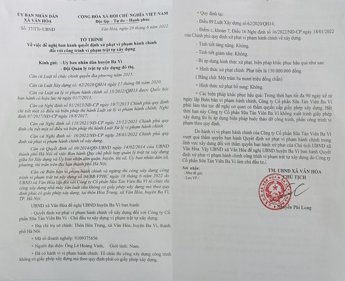 Theo nội dung tờ trình số 37, Công ty Cổ phần sữa Tản Viên Ba Vì là chủ đầu tư xây dựng vi phạm trật tự xây dựng. Người đại diện là ông Lê Hoàng Vinh, đã có hành vi vi phạm hành chính: Tổ chức thi công công trình không có giấy phép xây dựng mà theo quy định phải có giấy phép xây dựng. Hành vi của Công ty Cổ phần sữa Tản Viên Ba Vì, bị UBND xã Vân Hòa đề nghị mức phạt 130 triệu đồng.