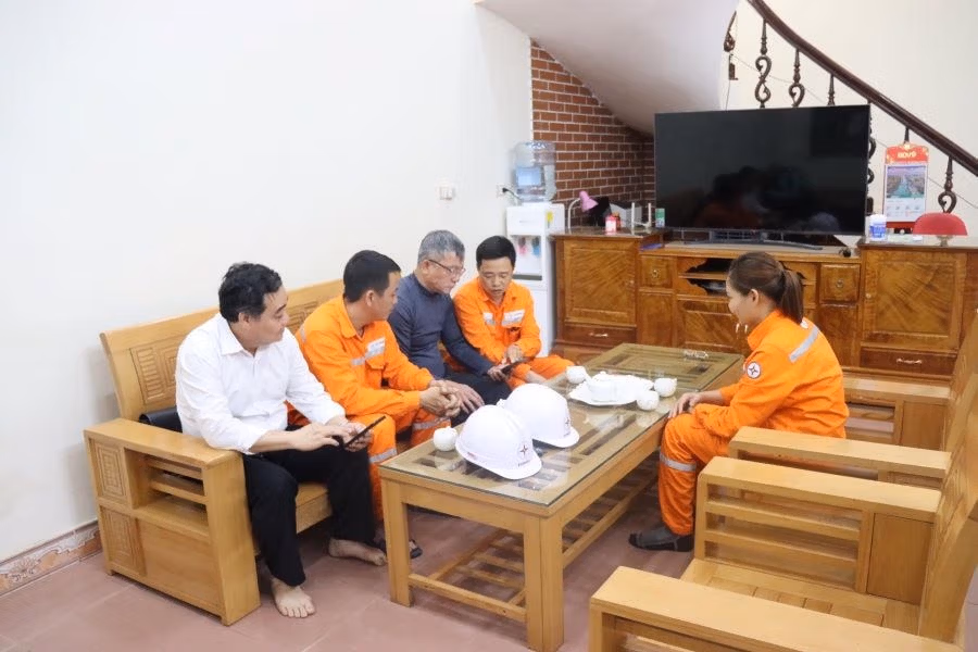 Ông Hoàng Văn Thắng đang được nhân viên Điện lực hướng dẫn tra cứu hóa đơn tiền đện trên app CSKH của EVNNPC