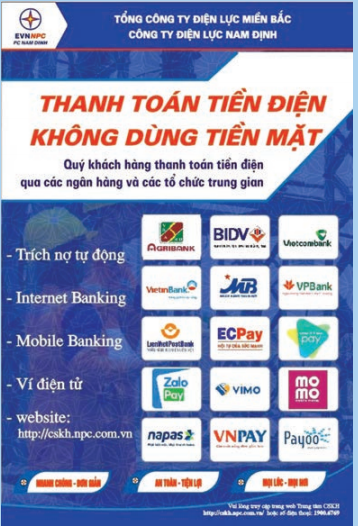 Cụ thể, Công ty đã ký kết, hợp tác với các tổ chức Ngân hàng đóng trên địa bàn tỉnh Nam Định, như: Ngân hàng Vietinbank, Agribank, BIDV, Lienvietpostbank, Vietcombank... để mở rộng, đa dạng hóa các hình thức thanh toán tiền điện.