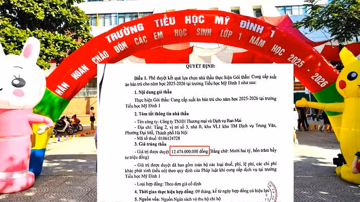Đến ngày 29/8/2025, Hiệu trưởng Trường Tiểu học Mỹ Đình 1 (phường Từ Liêm, Hà Nội) đã ký Quyết định số 138/QĐ-THMĐ1 phê duyệt kết quả lựa chọn nhà thầu thực hiện gói thầu “Cung cấp suất ăn bán trú cho năm học 2025-2026 tại Trường Tiểu học Mỹ Đình 1”. Công ty TNHH thương mại và dịch vụ Ban Mai được chỉ định trúng thầu với giá 12.474.000.000 đồng (gần 12,5 tỷ đồng). Nguồn vốn: Nguồn ngân sách và thu hộ chi hộ. Thời gian thực hiện hợp đồng là 9 tháng, kể từ ngày hợp đồng có hiệu lực.