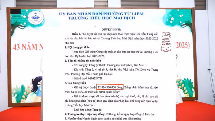 Theo Quyết định số 08/QĐ-THVH ngày 04/9/2025 của Trường Tiểu học Việt Hùng (xã Đông Anh, Hà Nội) phê duyệt kết quả lựa chọn nhà thầu gói thầu “Cung cấp suất ăn đối với mô hình nấu ăn tại bếp của nhà trường năm học 2025-2026”, Công ty TNHH thương mại và dịch vụ Ban Mai trúng thầu với giá 6.804.000.000 đồng (hơn 6,8 tỷ đồng). Thời gian thực hiện gói thầu là 9 tháng (từ ngày 08/9/2025 đến ngày 31/5/2026).