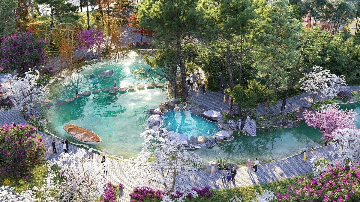 Ngay cạnh đó là những con nước được cách điệu, cùng đường sỏi đi ngang giữa suối, tạo nên khung cảnh nên thơ đặc biệt thu hút du khách.