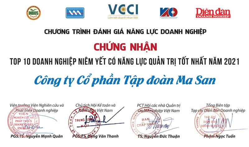 Ngày 23/12, chương trình “Đánh giá Năng lực hoạt động Doanh nghiệp - Vietnam Best Companies” 2021 do VCCI chủ trì đã trao Chứng nhận Top 10 Doanh nghiệp niêm yết có năng lực quản trị, năng lực cạnh tranh, sinh lời tốt nhất cho Tập đoàn Masan, Công ty Masan Consumer và Công ty CP Vinacafe Biên Hòa.