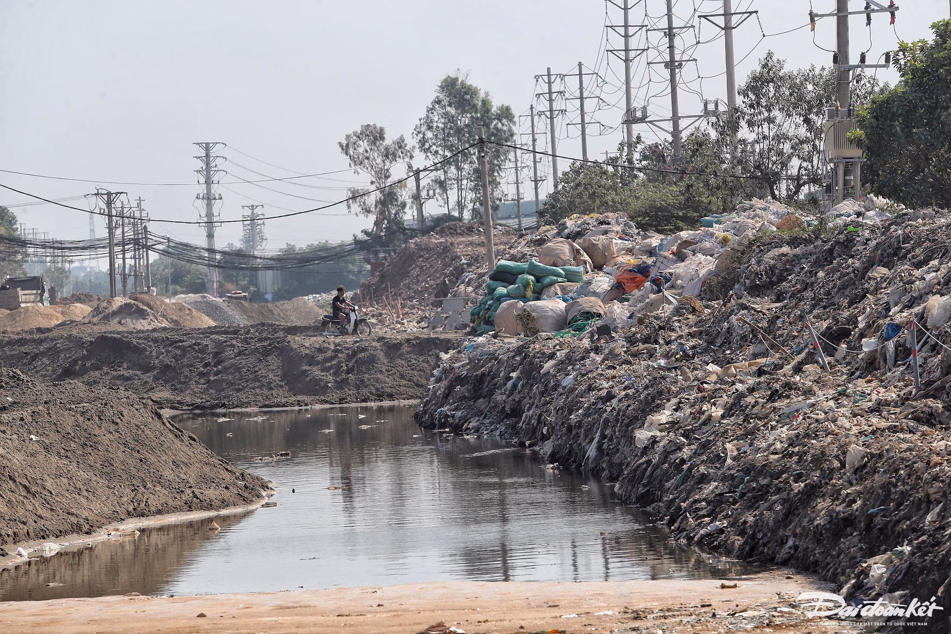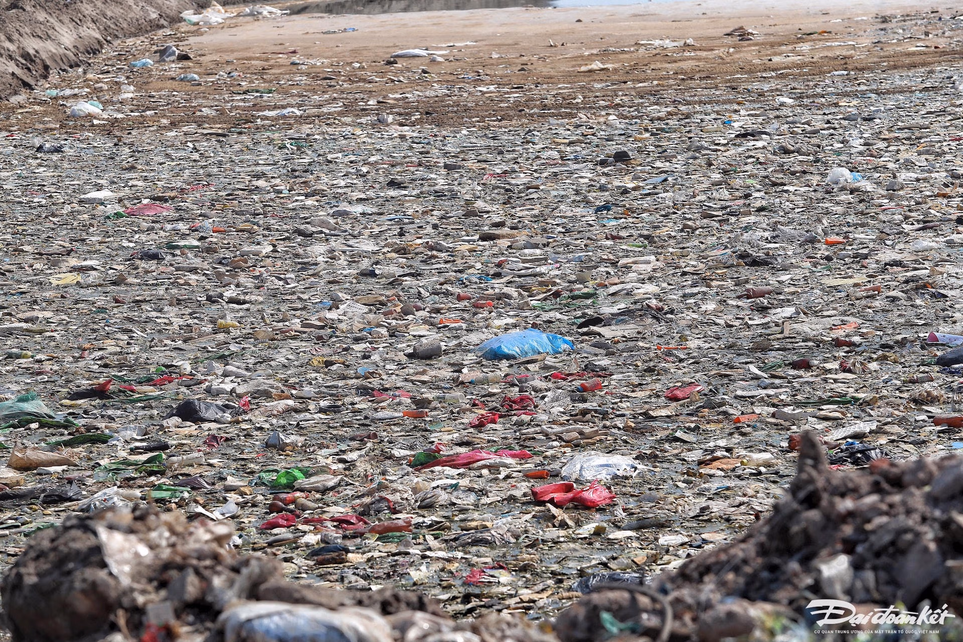 Tiếp tục đi sâu vào trong làng nghề, PV bắt gặp một dòng sông là bãi tập kết phế thải nhựa. Rác chất đầy hai bên bờ sông, lòng sông luôn đen ngòm, đặc quánh. Do lượng rác thải nhựa quá lớn nên thường xuyên tràn xuống sông.