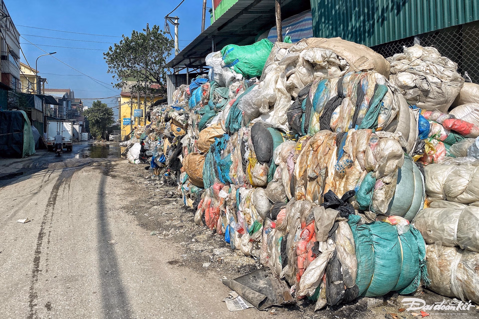 Để làm rõ phản ánh trên, ngày 19 và 20/11, PV Báo Đại Đoàn Kết đã có mặt tại làng nghề tái chế nhựa Minh Khai. Ngay từ đầu làng, PV đã bắt gặp những "núi" rác nhựa được chất kín, cao hàng chục mét ở khắp các con đường.