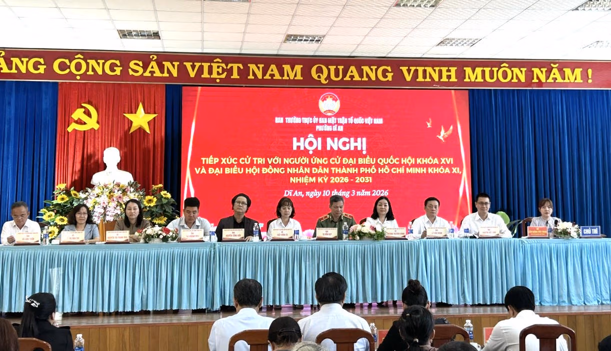 Ngày 10/3, Ban Thường trực Ủy ban Mặt trận Tổ quốc Việt Nam phường Dĩ An, TP Hồ Chí Minh tổ chức Hội nghị tiếp xúc cử tri với những người ứng cử đại biểu Quốc hội (QH) khóa XVI và đại biểu Hội đồng nhân dân (HĐND) thành phố khóa XI, nhiệm kỳ 2026–2031.