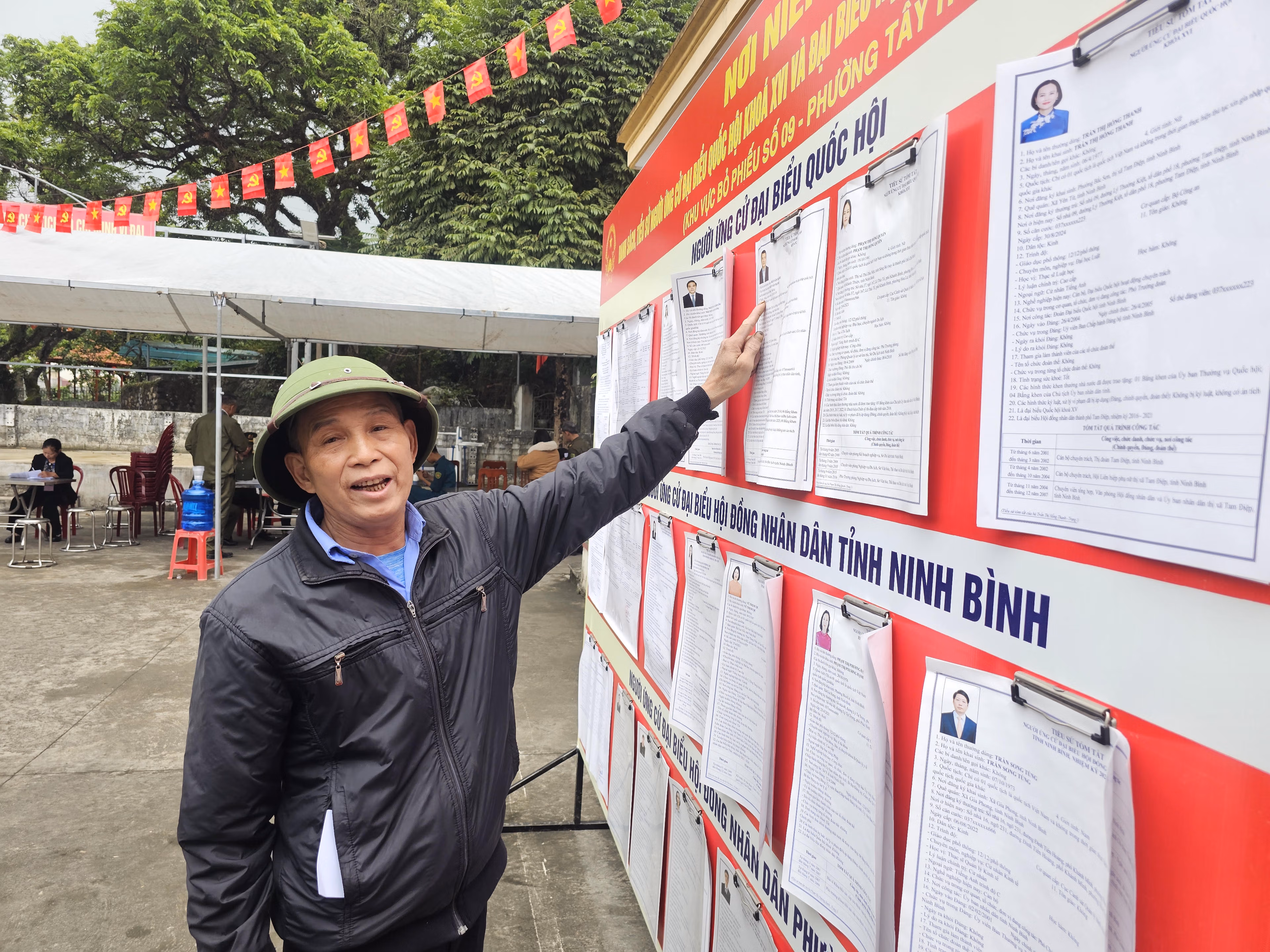 Thực hiện quyền và nghĩa vụ bầu cử tại khu vực bỏ phiếu số 9, ông Nguyễn Văn Minh (66 tuổi, cử tri tổ dân phố Tam Kỳ, phường Tây Hoa Lư) cho biết: Nhờ du lịch địa phương phát triển nên dù đã qua tuổi nghỉ hưu, ông vẫn có thể chọn được một công việc bảo vệ tại một công ty kinh doanh homestay tại Tràng An với mức lương hơn 5 triệu đồng/tháng.
