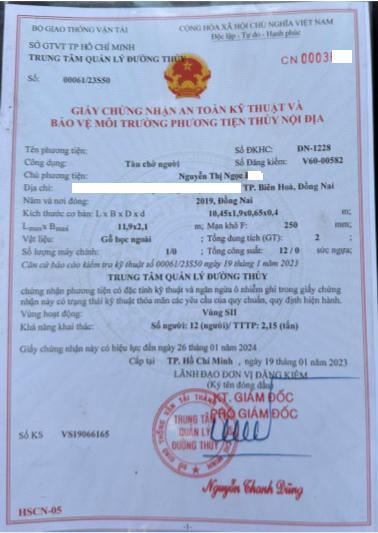 Tàu được cấp phép chở 12 người với công suất máy 12cv. Phương tiện này đã được Trung tâm quản lý đường thủy (Sở Giao thông vận tải TPHCM) kiểm tra ngày 19/1/2023, cấp Giấy chứng nhận an toàn thời hạn đến 26/1/2024.