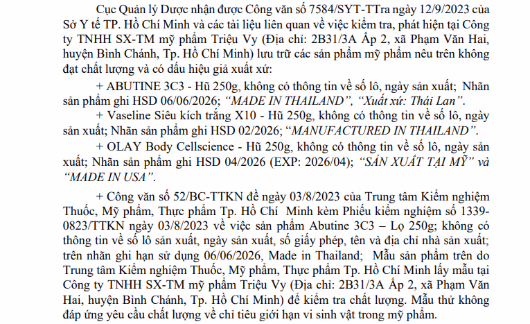 Theo văn bản này, trước đó, Cục Quản lý Dược nhận được công văn của Thanh tra Sở Y tế TP HCM và các tài liệu liên quan về việc kiểm tra, phát hiện tại Công ty TNHH SX-TM mỹ phẩm Triệu Vy (địa chỉ: 2B31/3A Ấp 2, xã Phạm Văn Hai, huyện Bình Chánh, TP HCM) lưu trữ các sản phẩm mỹ phẩm nêu trên không đạt chất lượng và có dấu hiệu giả xuất xứ.