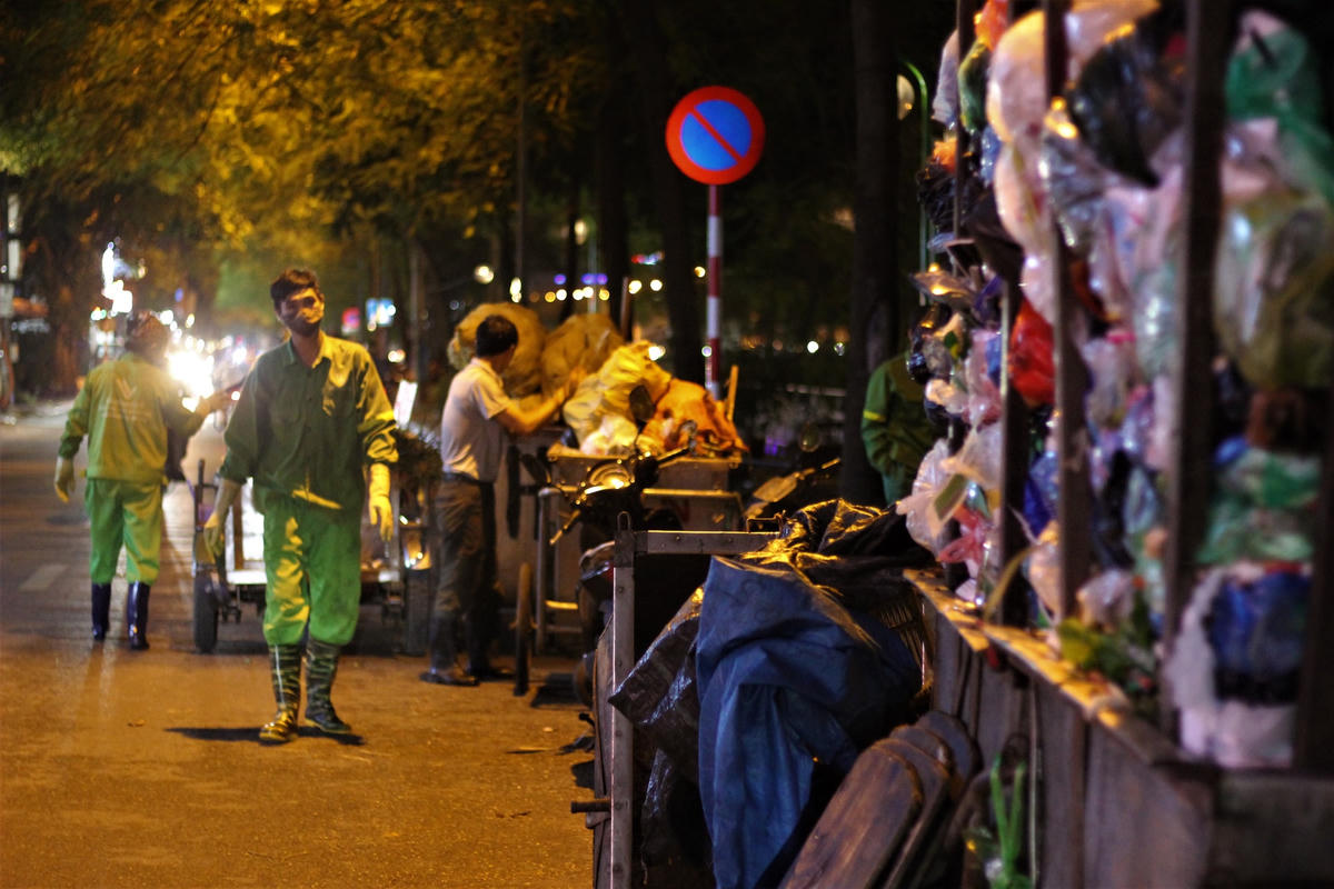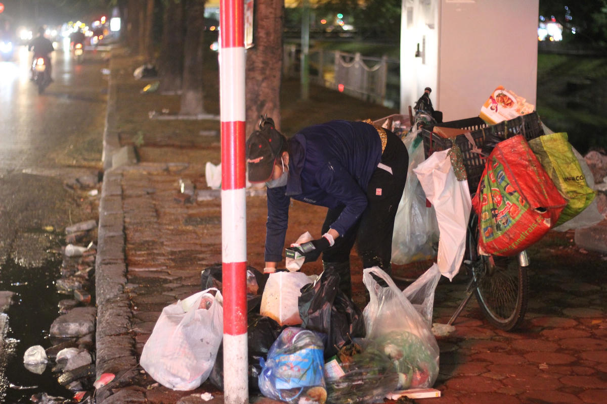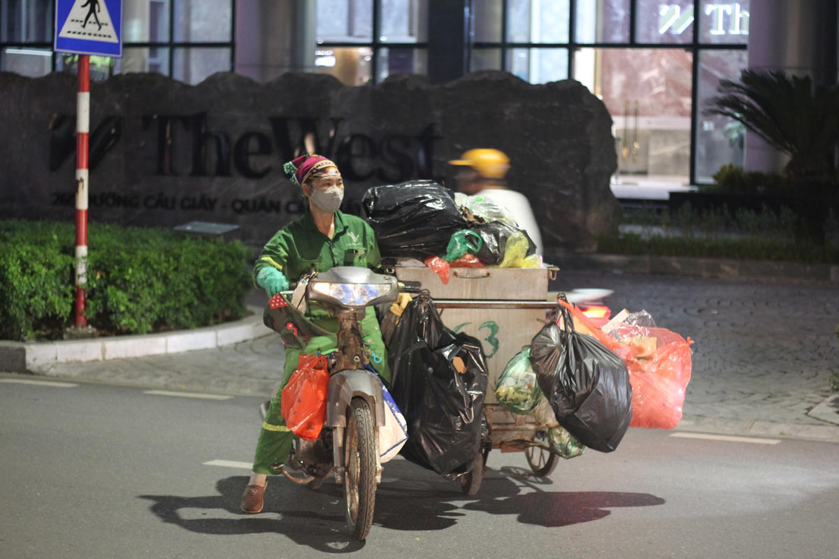 Tưởng chừng khi màn đêm bao trùm sẽ là lúc người người vui vẻ, nghỉ ngơi sau 1 ngày dài làm việc mệt nhọc. Nhưng đây lại chính là thời điểm bắt đầu công việc của người lao động về đêm. Ảnh: Huy Tuấn.Hàng đêm, hình ảnh quét rác bên lề đường của người công nhân đến tờ mờ sáng đã trở nên quá đỗi quen thuộc.Tỉ mẩn với công việc của mình dù vất vả. Chiếc xe không còn nguyên vẹn trở thành phương tiện giúp người công nhận đưa rác đến điểm tập kết.Màn đêm rũ xuống, không ít người mò mẫm trong từng túi rác để có thể thu nhặt những chiếc chai nhựa để đưa đi bán kiếm từng đồng lo cho cuộc sống bộn bề. Đã hơn 10h tối, bà Tứ (74 tuổi) vẫn ngồi bên vỉa hè mong ngóng khách mua số trứng của bà. Bà tâm sự:"Số trứng này là gà nhà bà đẻ được. Cứ tối đến bà lại đưa ra đây bán. Bán không được nhiều nên vẫn phải cố ngồi lại đến khuya mong có người mua".Chị chủ ngồi ngóng khách bên chiếc xe hàng quen thuộc."Ai xôi lạc, bánh khúc đây" , tiếng rao trên chiếc xe đạp len lỏi qua từng con ngõ vào đêm muộn.Người dân phường Dịch Vọng (quận Cầu Giấy) luôn thấy hình ảnh anh Sinh (45 tuổi) cần mẫn với công việc từ sáng đến tối muộn. Anh Sinh chia sẻ: "Công việc này vất vả lắm, làm quần quật từ sáng đến tối nhưng vì kế sinh nhai nên anh phải cố gắng thôi. Làm đến lúc nhà nhà đều tắt đèn đi ngủ thì lúc đấy công việc cũng dần xong".