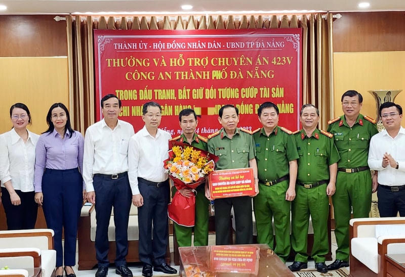 Sáng 24/4, Bí thư Thành ủy Nguyễn Văn Quảng và Chủ tịch UBND TP Đà Nẵng Lê Trung Chinh, thay mặt lãnh đạo TP đã khen thưởng và trao hỗ trợ lực lượng chuyên án 423 V của Công an TP này về thành tích đấu tranh, bắt giữ nhanh thủ phạm cướp chi nhánh ngân hàng Vietinbank ở số 3 - 5 đường Đống Đa, quận Hải Châu vào trưa 20/4.