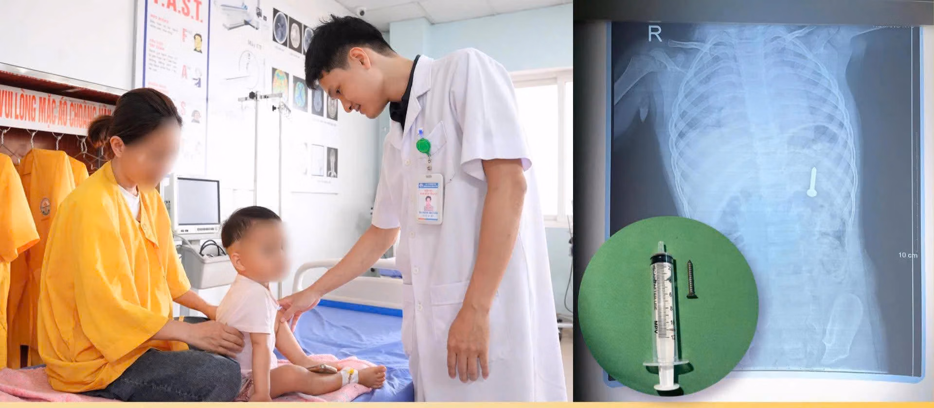 Theo thông tin ban đầu, bệnh nhi L.B.N. (trú tại xã Gio Linh) được gia đình đưa đến viện trong tình trạng hoảng loạn sau khi nuốt phải một chiếc đinh vít dài khoảng 2,5cm khi đang chơi đùa. Trước đó, người mẹ đã cố gắng vỗ lưng để đẩy dị vật ra ngoài, tuy nhiên hành động này khiến chiếc đinh trôi sâu hơn vào cơ thể.