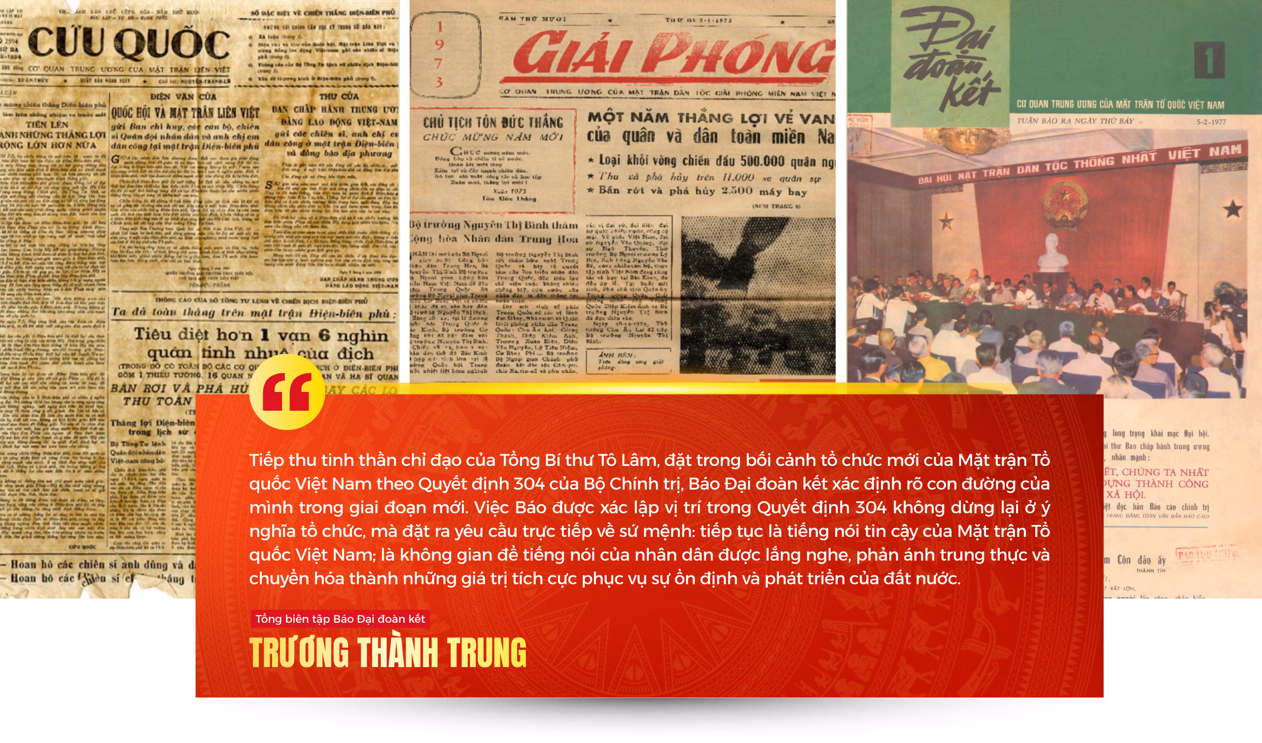 Ngay sau Quyết định 304 của Bộ Chính trị, Ban Thường trực Ủy ban Trung ương MTTQ Việt Nam cũng đã ban hành quyết định về tổ chức bộ máy của Báo Đại đoàn kết, trên cơ sở đó, Báo Đại đoàn kết đã có một bộ máy tổ chức mới theo hướng tinh gọn, hiệu quả. Việc kiện toàn tổ chức bộ máy của Báo theo hướng tinh gọn, hiệu quả, cùng với đổi mới phương thức tổ chức nội dung, phát triển hệ sinh thái số và gắn hoạt động báo chí với các hoạt động xã hội thiết thực, không nhằm tạo ra những thay đổi hình thức. Đó là quá trình chuẩn bị nội lực để tờ báo tiếp tục làm tốt hơn vai trò cầu nối giữa Đảng, Nhà nước, Mặt trận với nhân dân, trong một giai đoạn mà yêu cầu về sự đồng thuận, chia sẻ và niềm tin xã hội trở nên quan trọng hơn bao giờ hết.